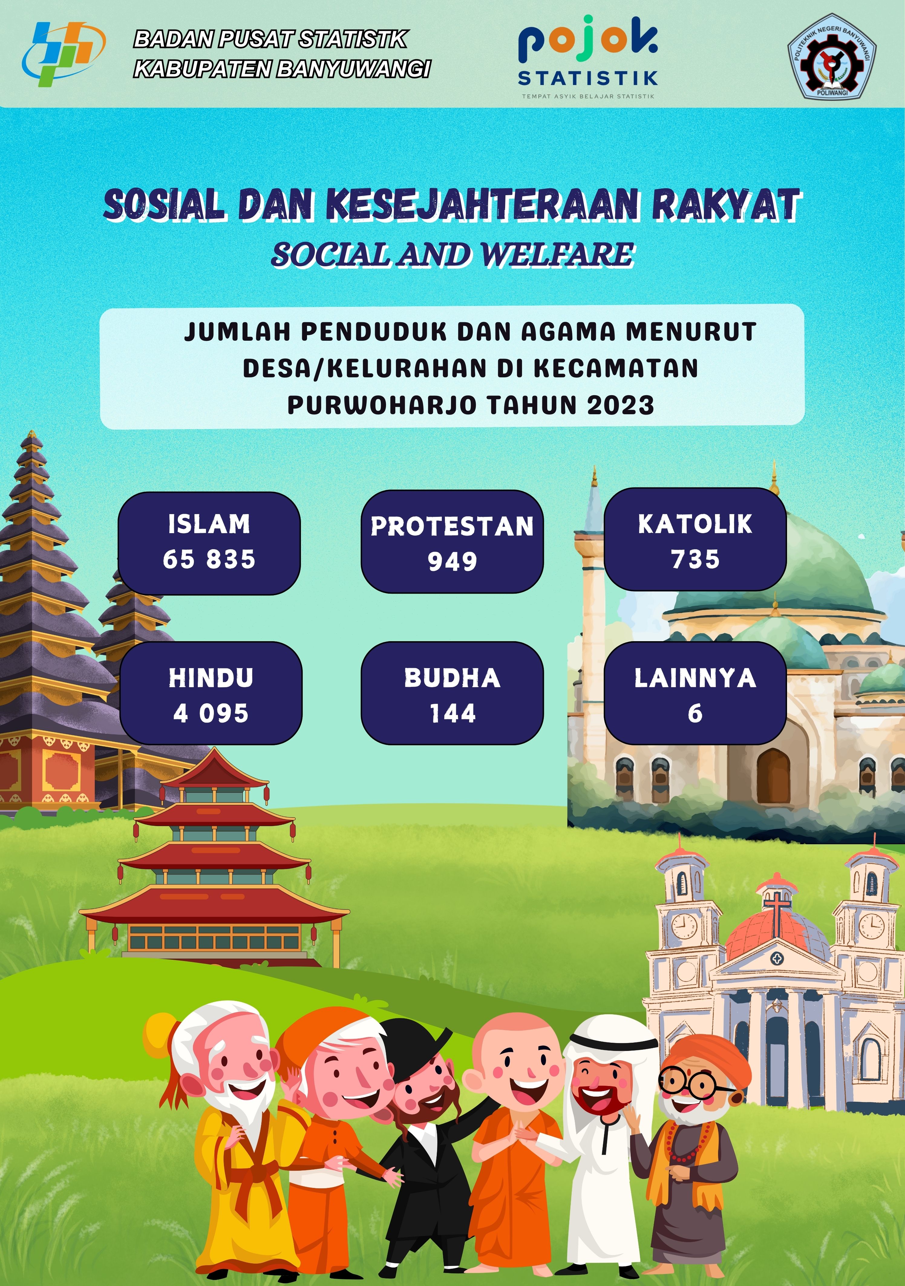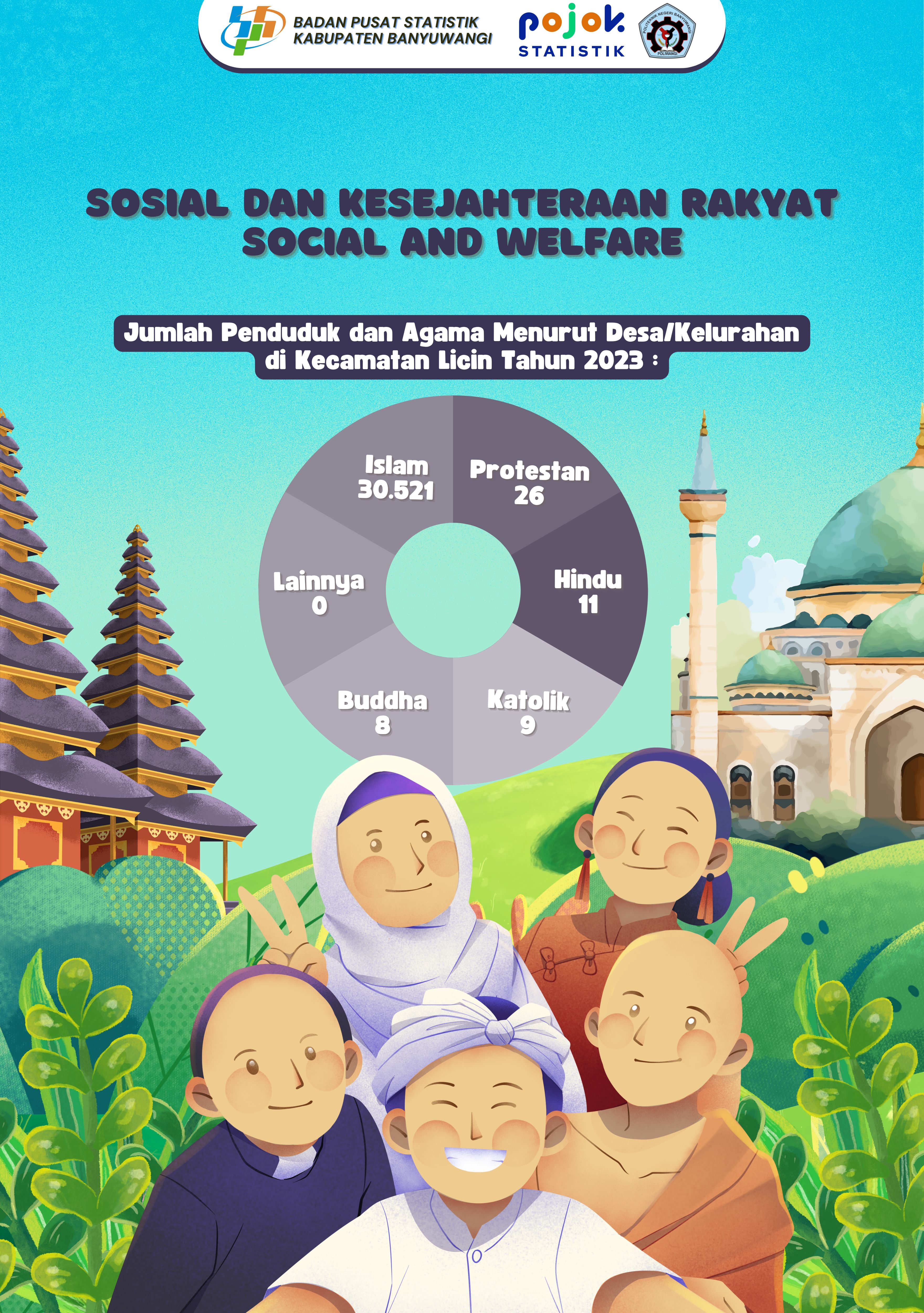 Pada infografis sosial dan kesejahteraan rakyat tersebut menampilkan jumlah penduduk dan agama menurut desa/kelurahan di Kecamatan Licin tahun 2023