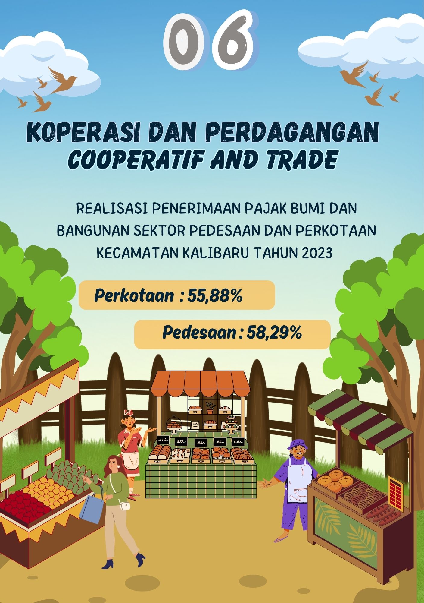 Pada Infografis Koperasi dan Perdagangan menunjukkan jumlah persen realisasi penerimaan pajak bumi dan bangunan sektor perkotaan dan pedesaan di Kecamatan Kalibaru pada tahun 2023