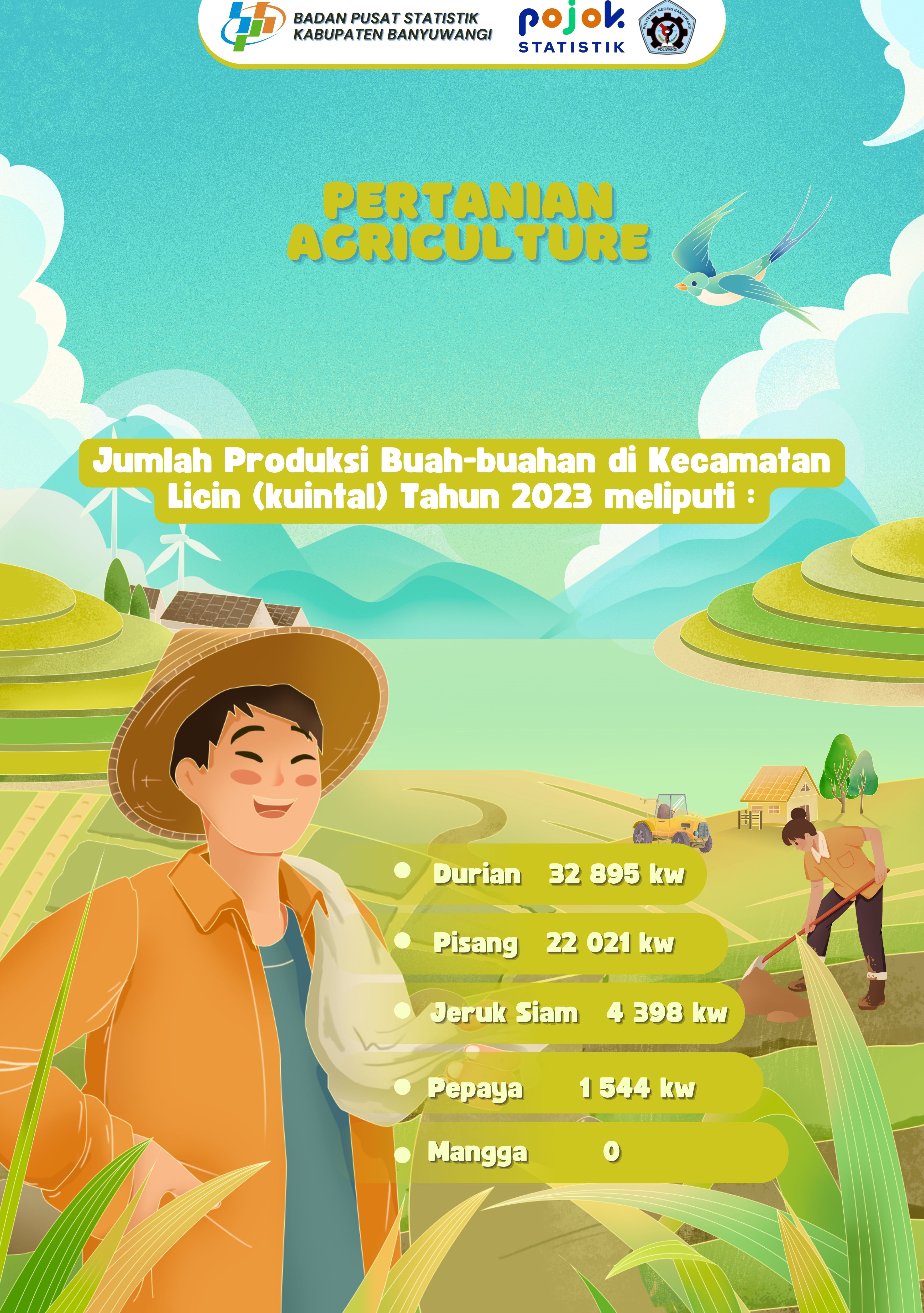 Pada infografis pertanian tersebut menampilkan jumlah produksi buah-buahan di Kecamatan Licin tahun 2023