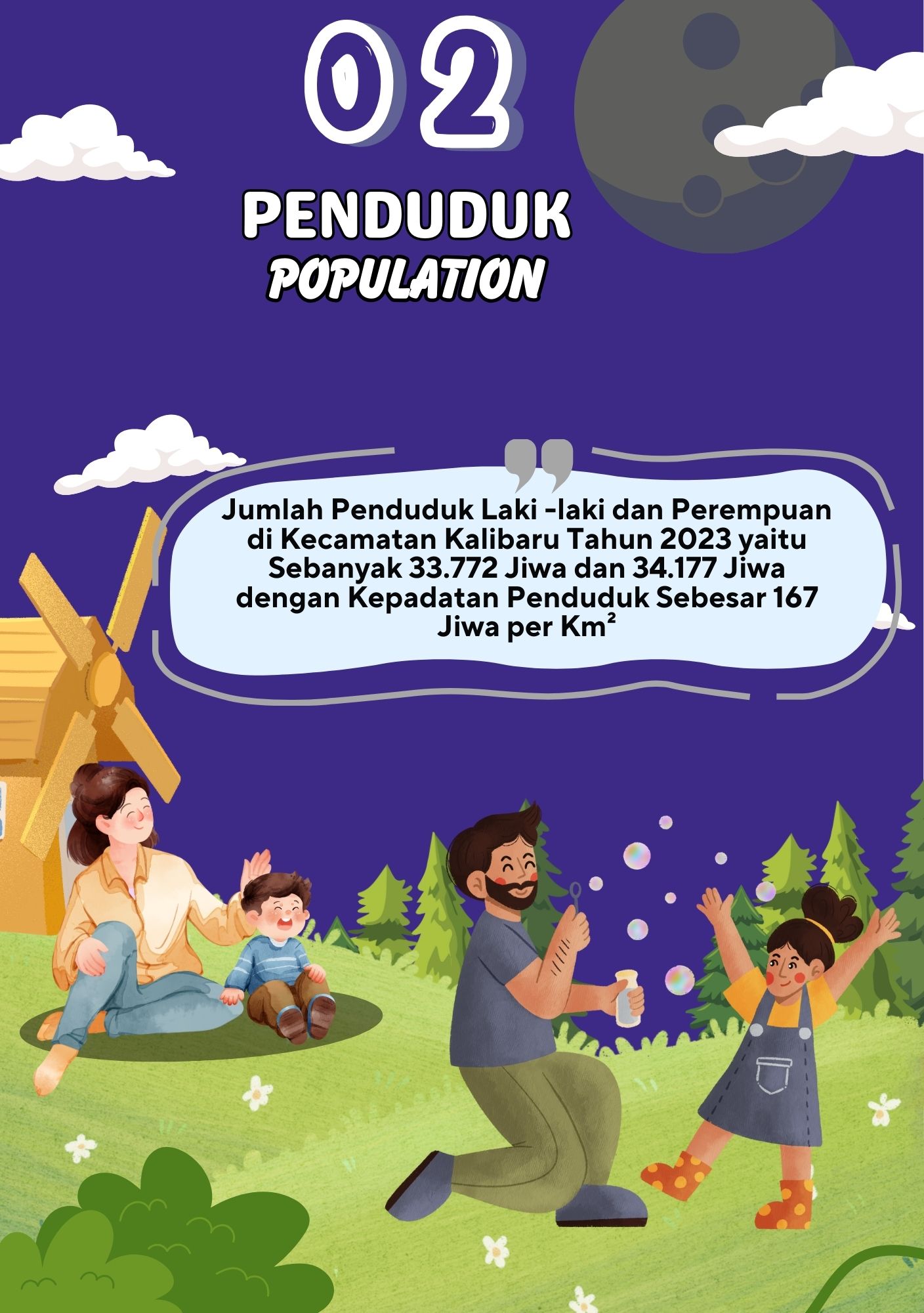 Pada infografis Penduduk menunjukkan jumlah penduduk dengan kepadatan penduduk yang berada di Kecamatan Kalibaru berdasarkan jenis kelamin pada tahun 2023