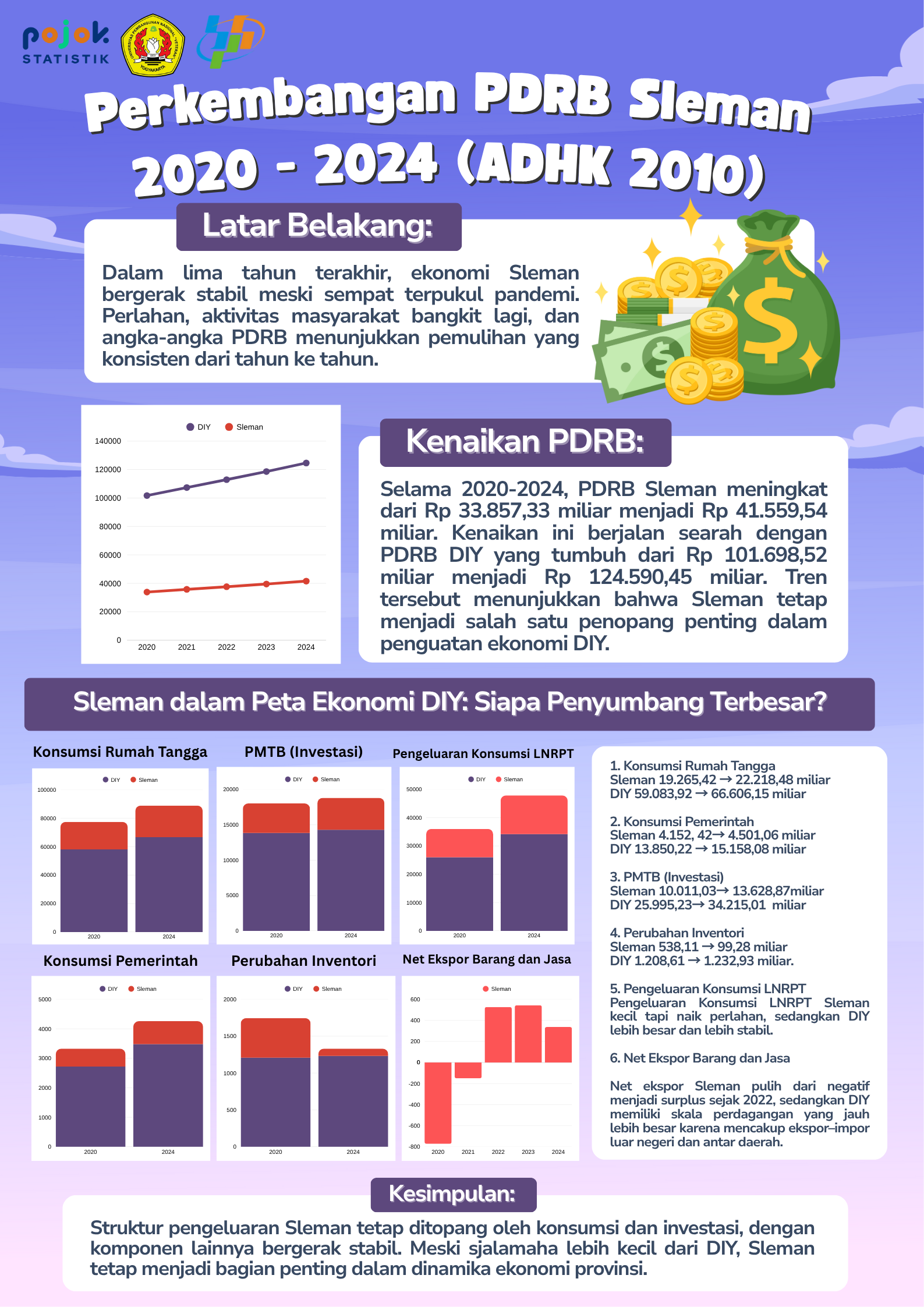 Ekonomi Sleman tumbuh stabil pascapandemi! PDRB meningkat dari Rp 33,857 triliun (2020) menjadi Rp 41,559 triliun (2024). Pertumbuhan ini sejalan dengan peningkatan ekonomi DIY secara...