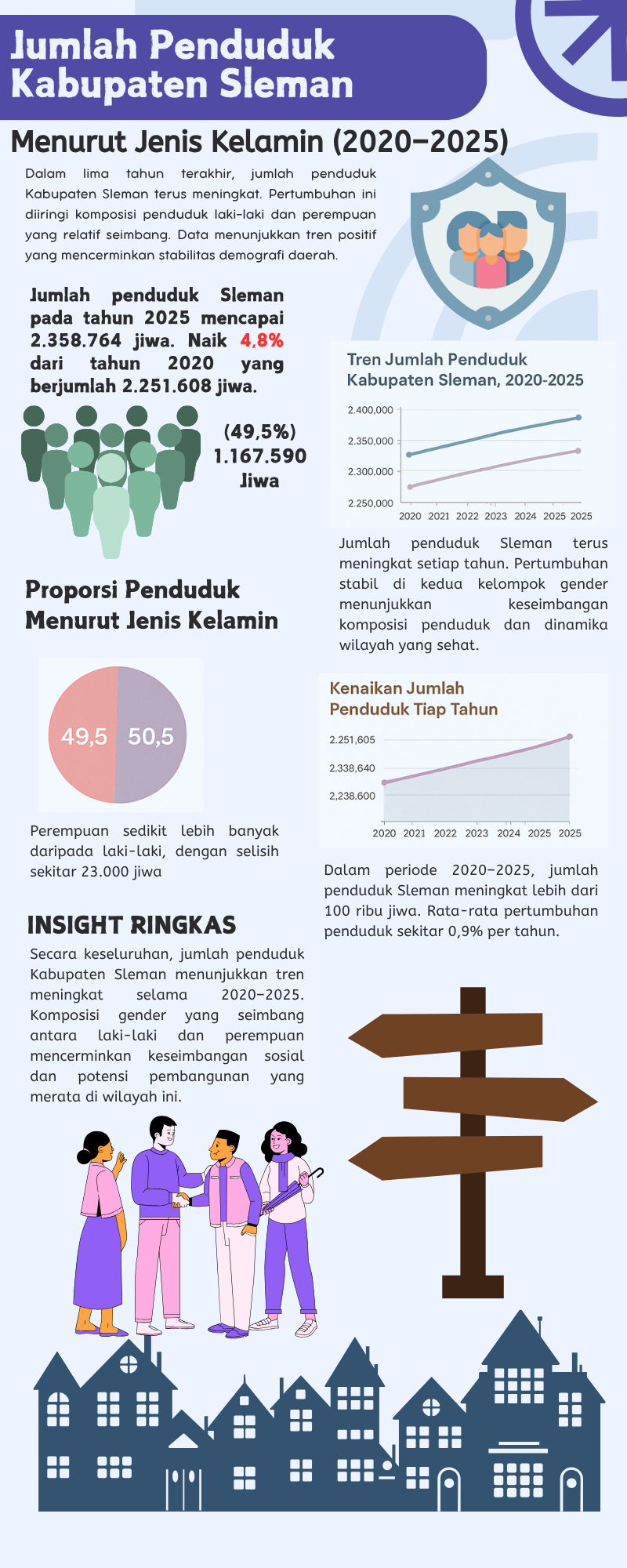 “Pertumbuhan penduduk Sleman terus nanjak! Tahun 2025 jumlah penduduk mencapai 2,35 juta jiwa, naik 4,8% dari 2020. Komposisi gender juga seimbang meskipun perempuan sedikit lebih...