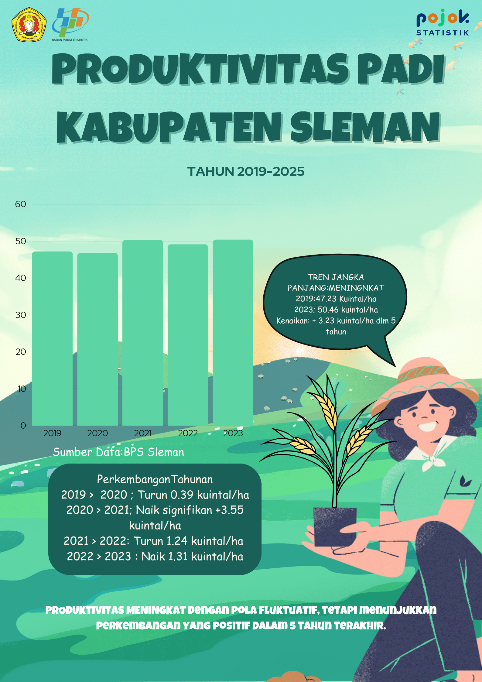 Produktivitas padi Sleman terus menunjukkan tren positif! Meski fluktuatif, produktivitas padi meningkat dari 47,23 ku/ha (2019) menjadi 50,46 ku/ha (2023). Kenaikan 3,23 kuintal/ha dalam lima...