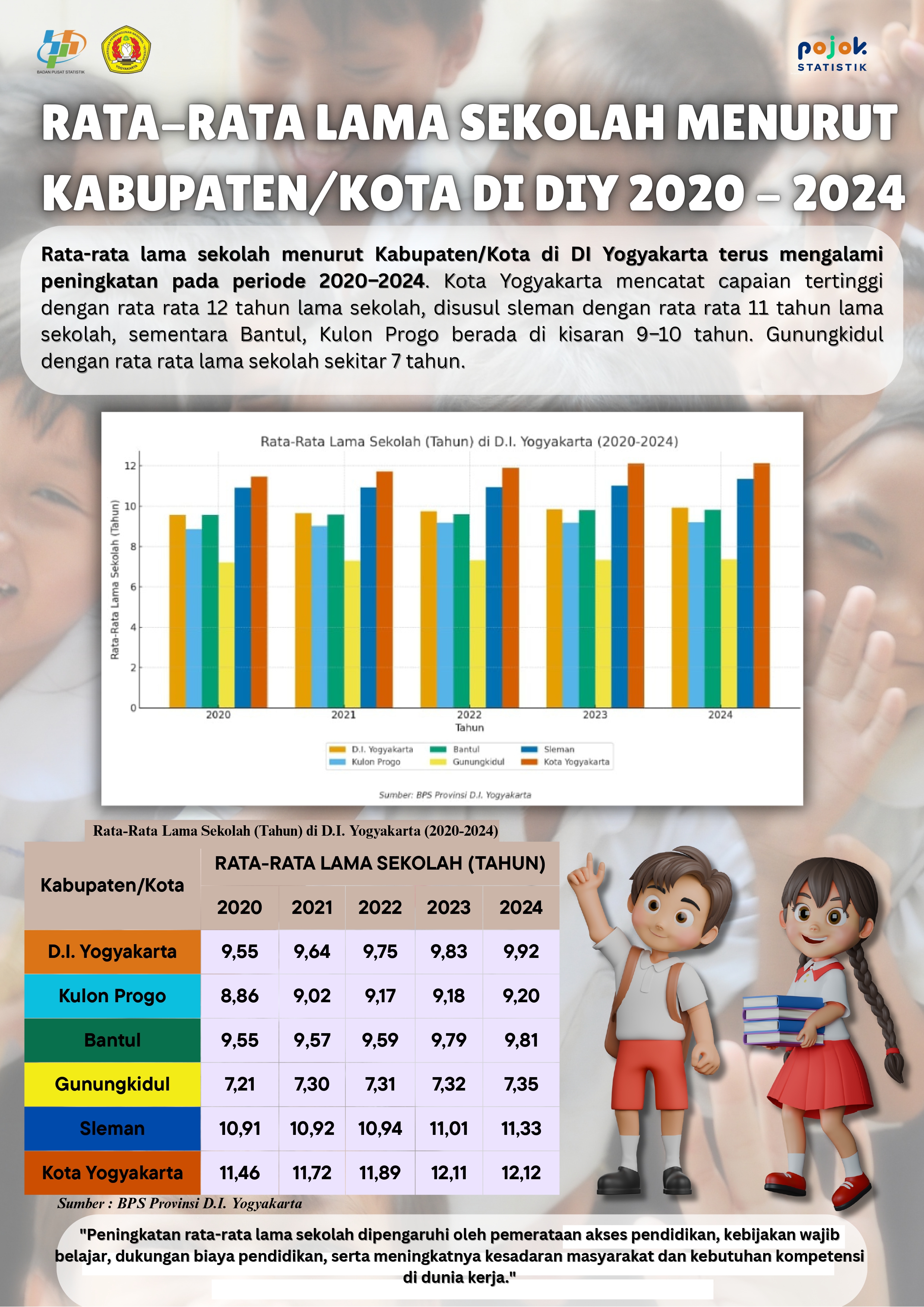 Rata-rata lama sekolah menurut Kabupaten/Kota di D.I. Yogyakarta terus mengalami peningkatan pada periode 2020-2024 dengan Kota Yogyakarta yang meraih rata-rata sekolah tertinggi.
