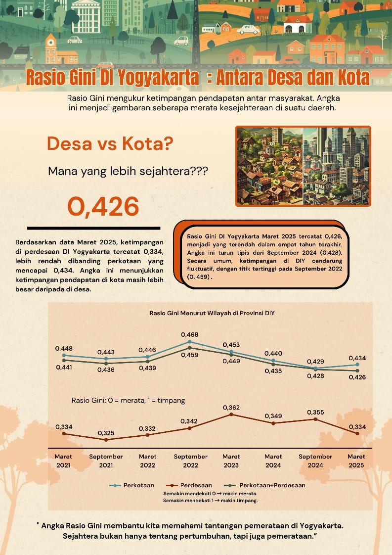 Rasio Gini mengukur ketimpangan pendapatan antar masyarakat. Pada Maret 2025, rasio gini D.I. Yogyakarta tercatat sebesar 0,426.