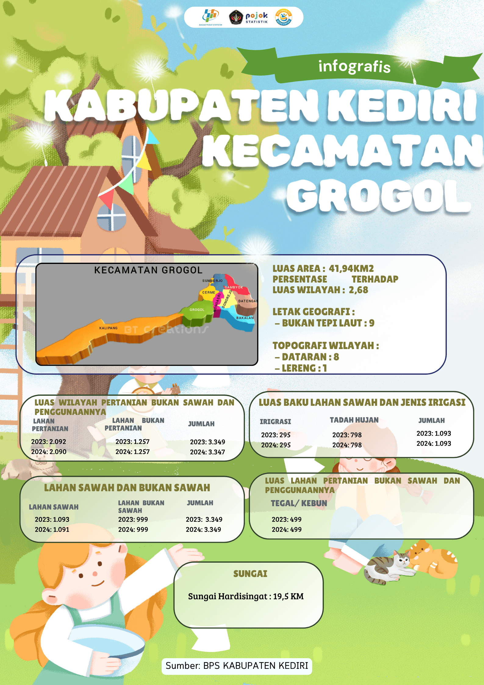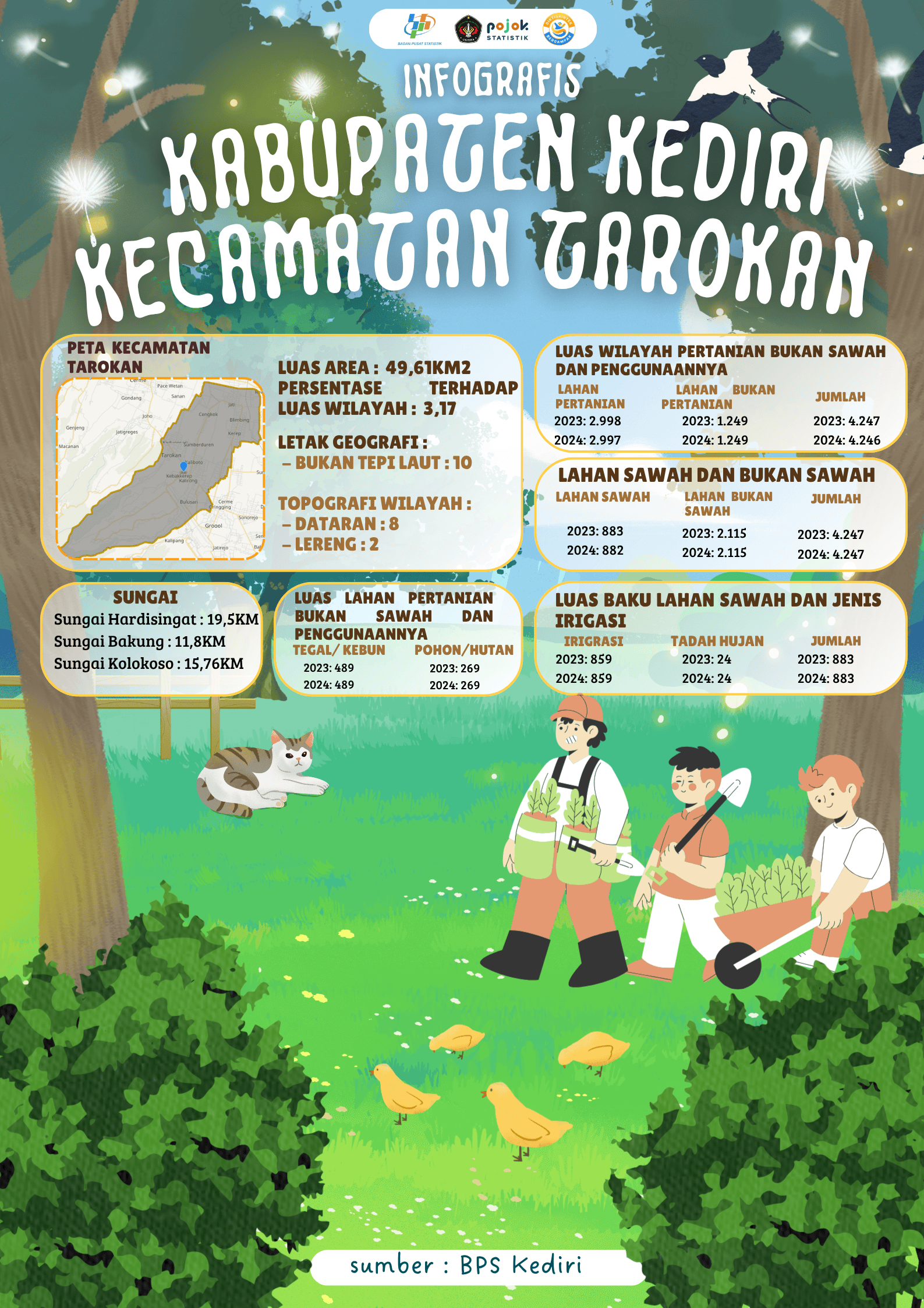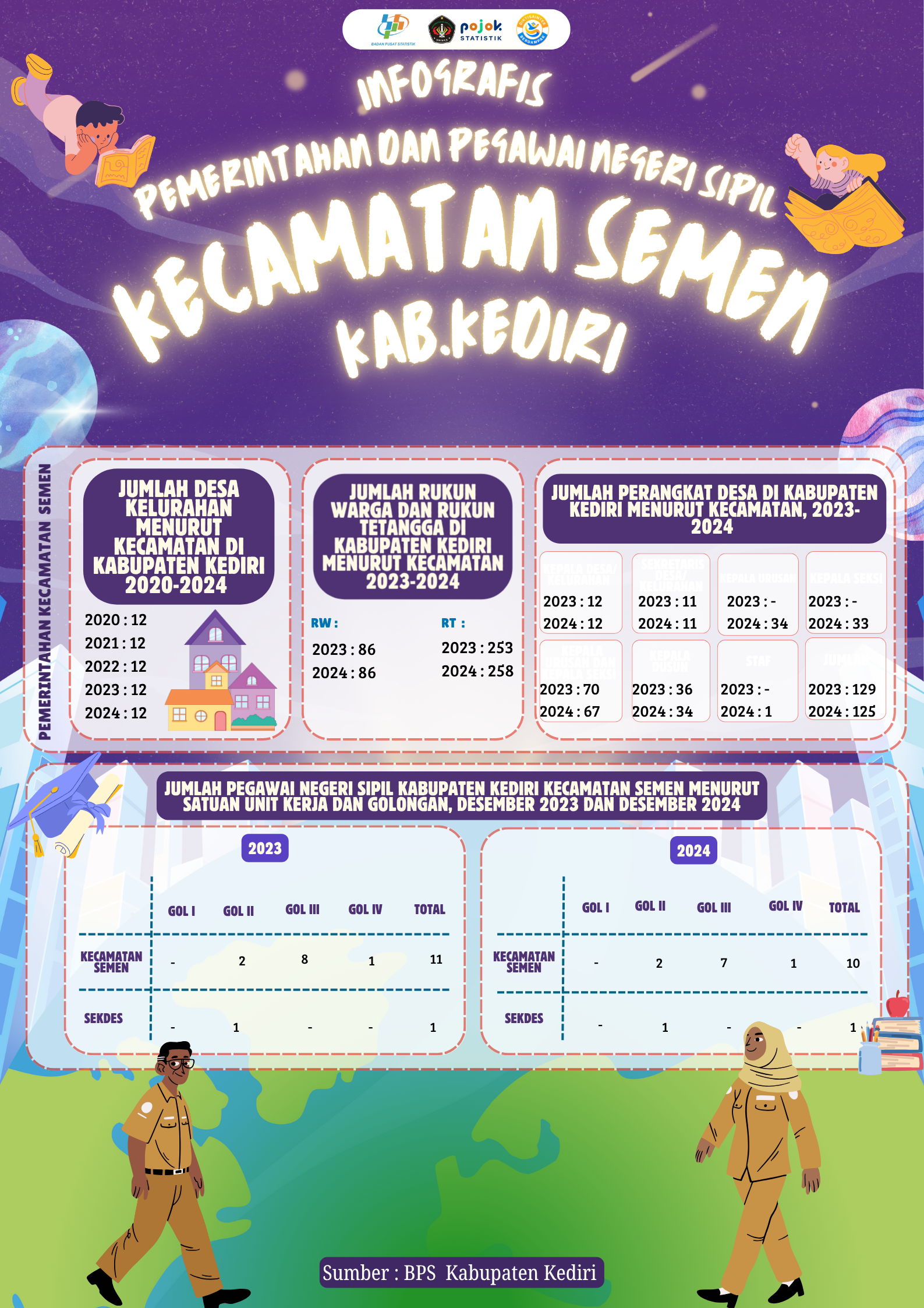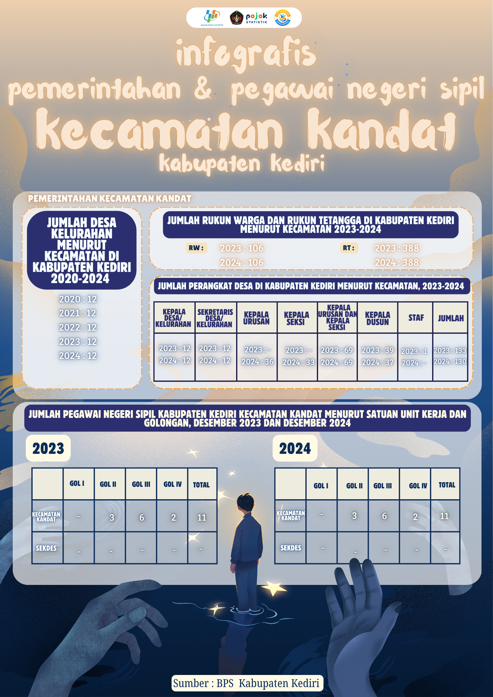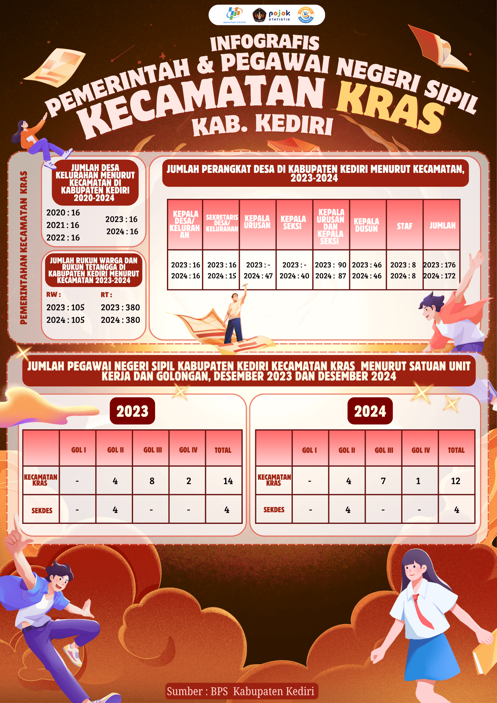 Infografis ini memuat data pemerintahan dan PNS Kecamatan Kandat, Kabupaten Kediri, tahun 2023–2024. Jumlah desa tetap 12, RW 106, dan RT 388. Perangkat desa berkurang...