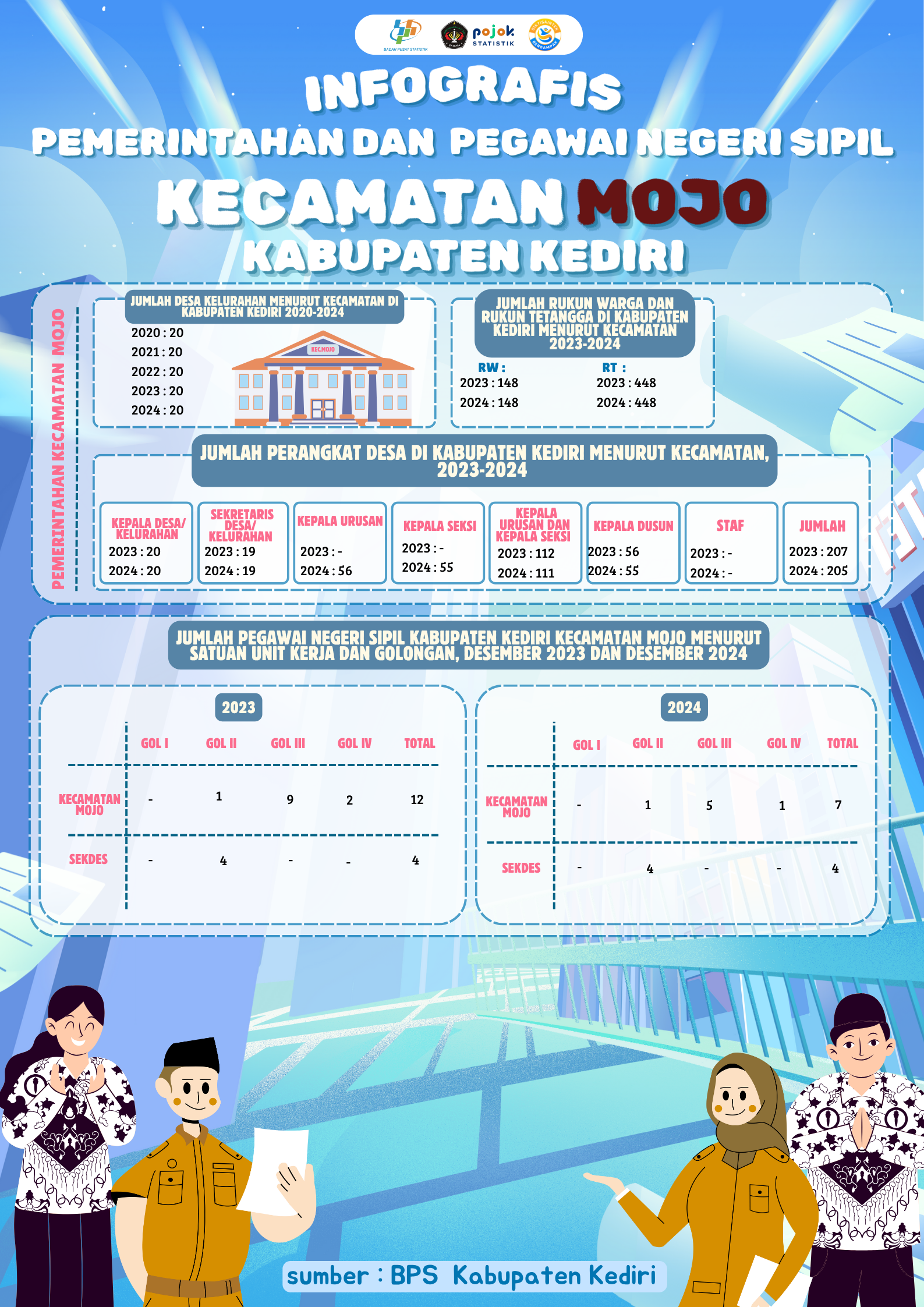 Infografis ini menampilkan data pemerintahan dan PNS di Kecamatan Mojo, Kabupaten Kediri, tahun 2023–2024. Jumlah desa tetap 20, RW 148, dan RT 448. Perangkat desa...