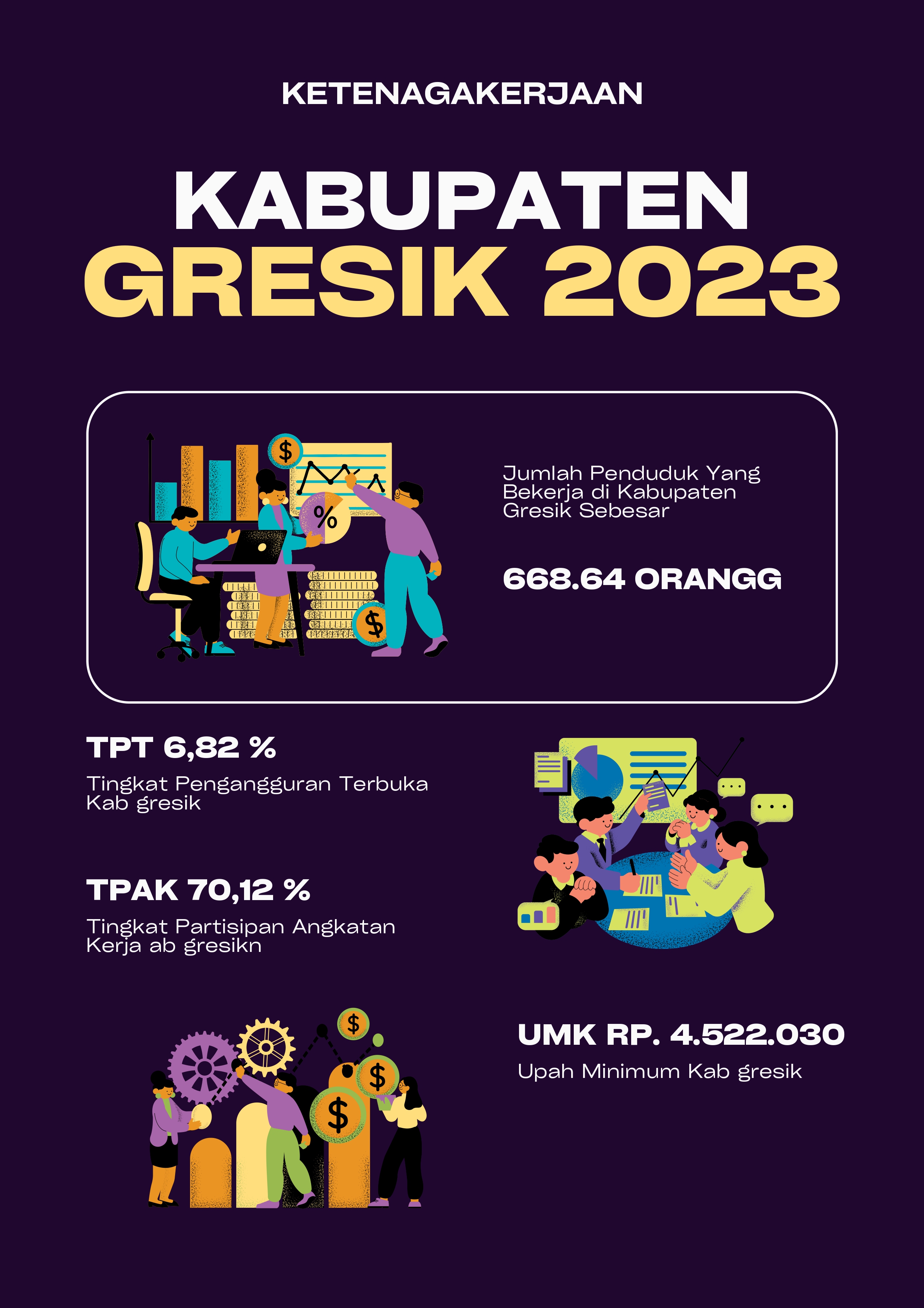 Infografis ini menyajikan data ketenagakerjaan Kabupaten Gresik tahun 2023 yang mencakup beberapa indikator penting, seperti jumlah penduduk yang bekerja, Tingkat Partisipasi Angkatan Kerja (TPAK), Tingkat...