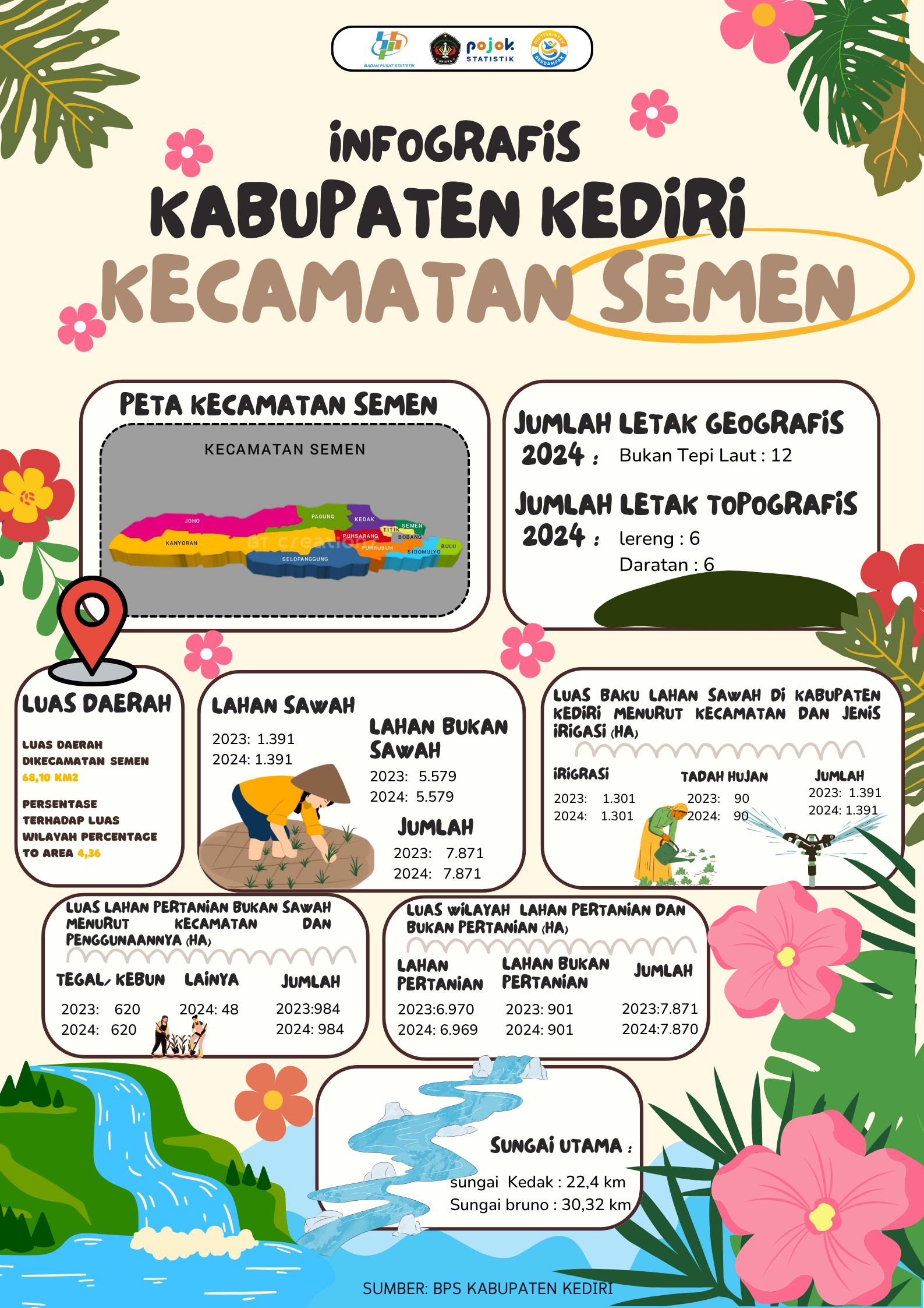 Kecamatan Semen terletak di barat Sungai Brantas dan berbatasan dengan Kota Kediri. Wilayah ini memanjang dari Sungai Brantas ke arah barat hingga kawasan Gunung Wilis.