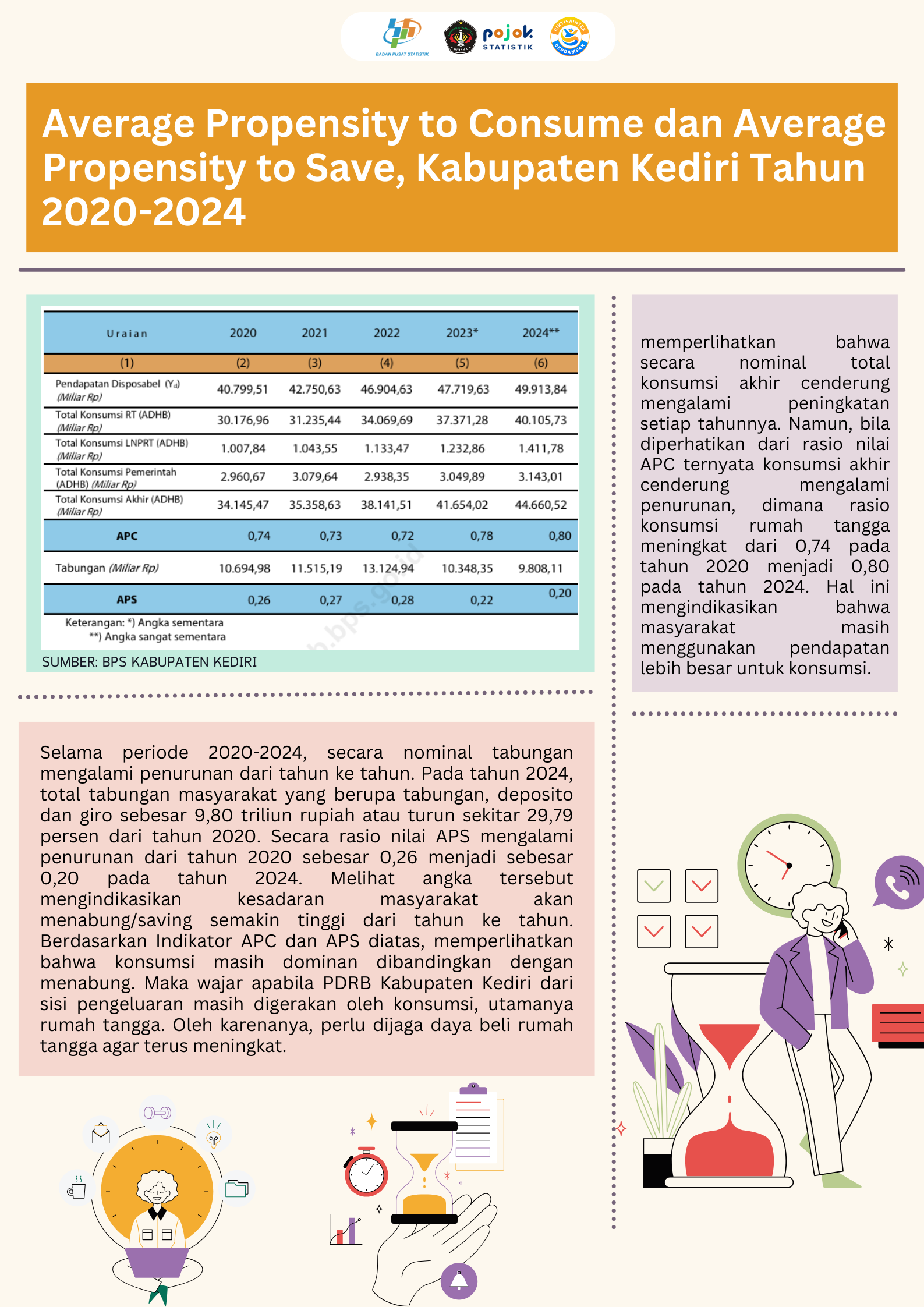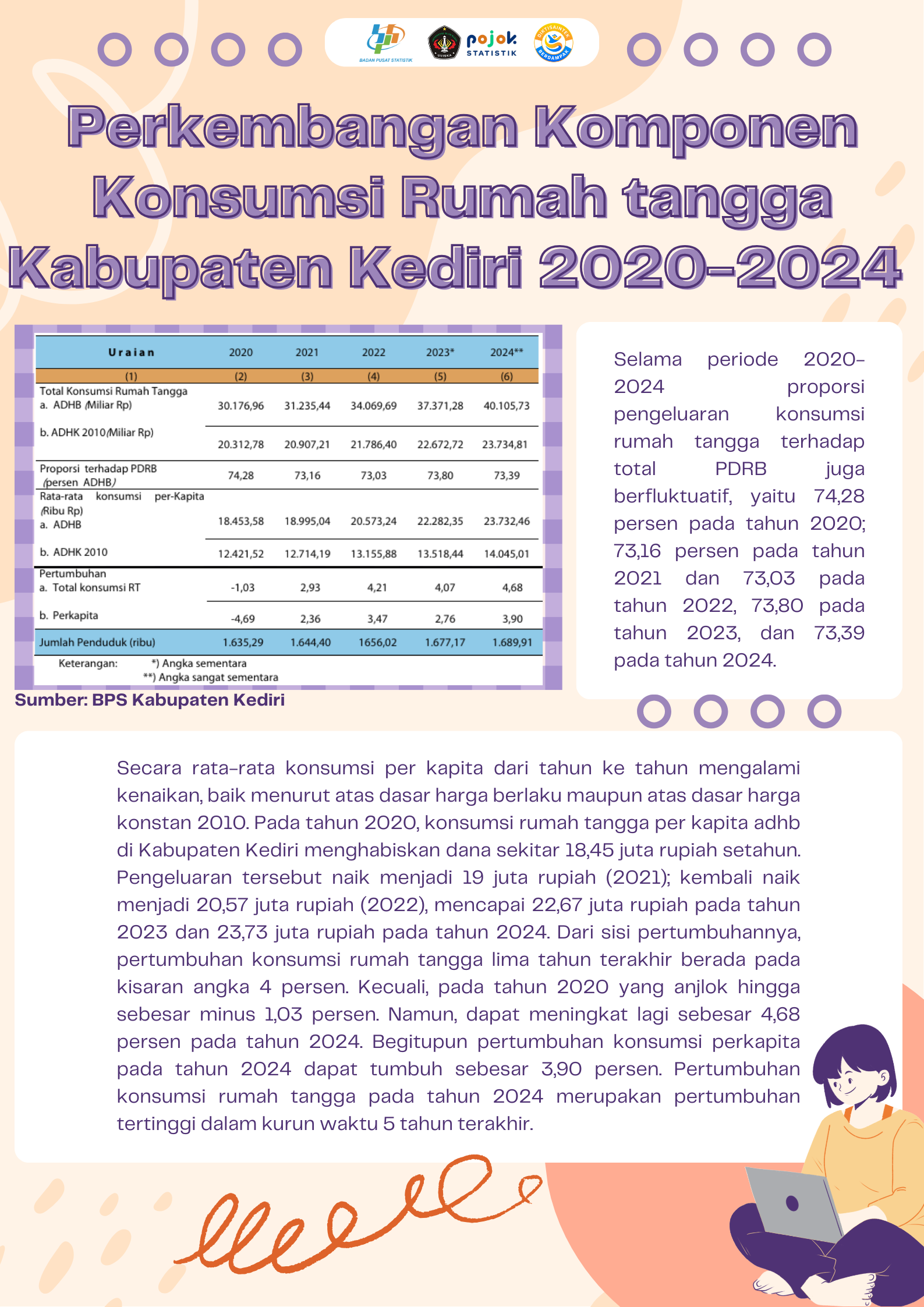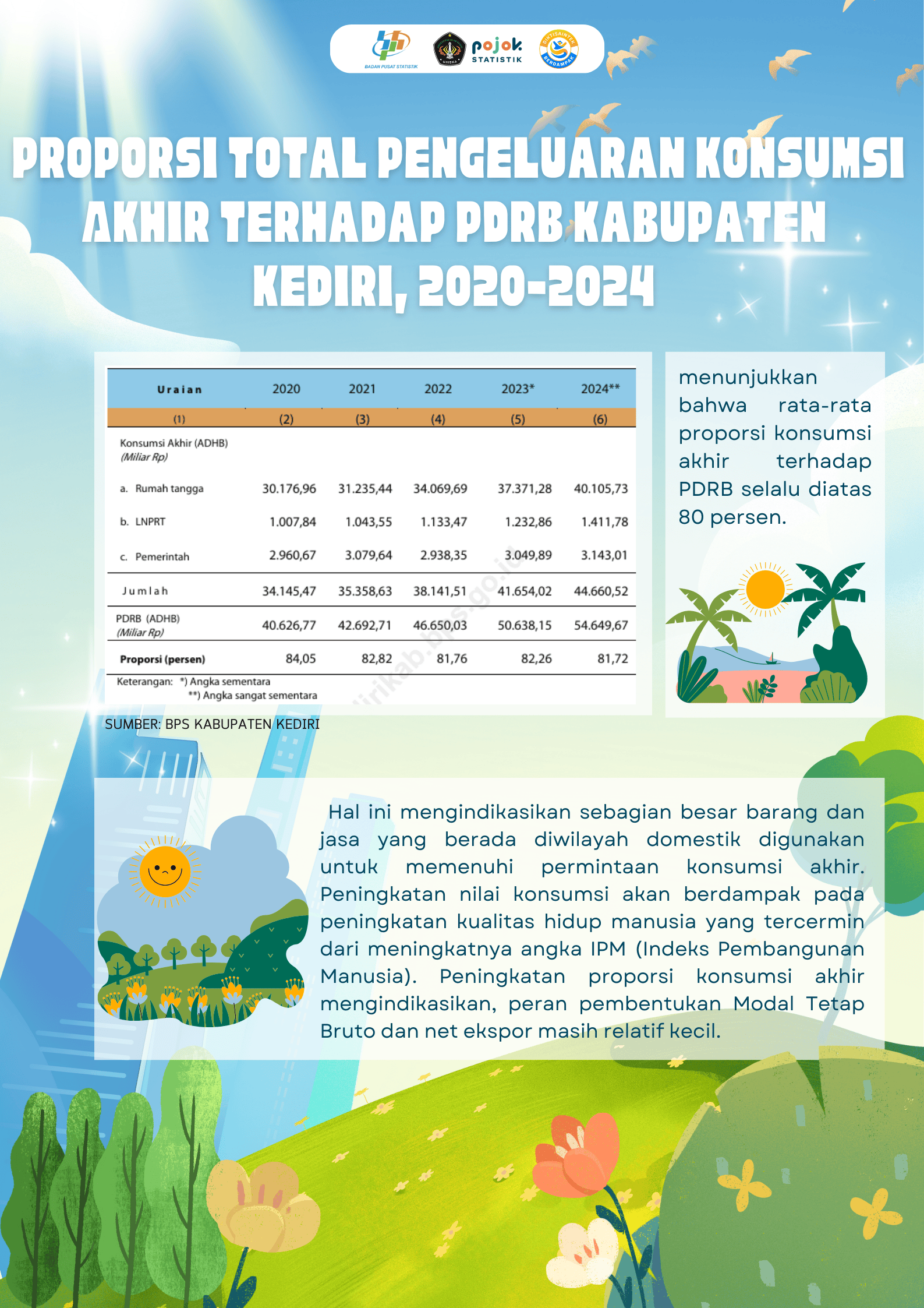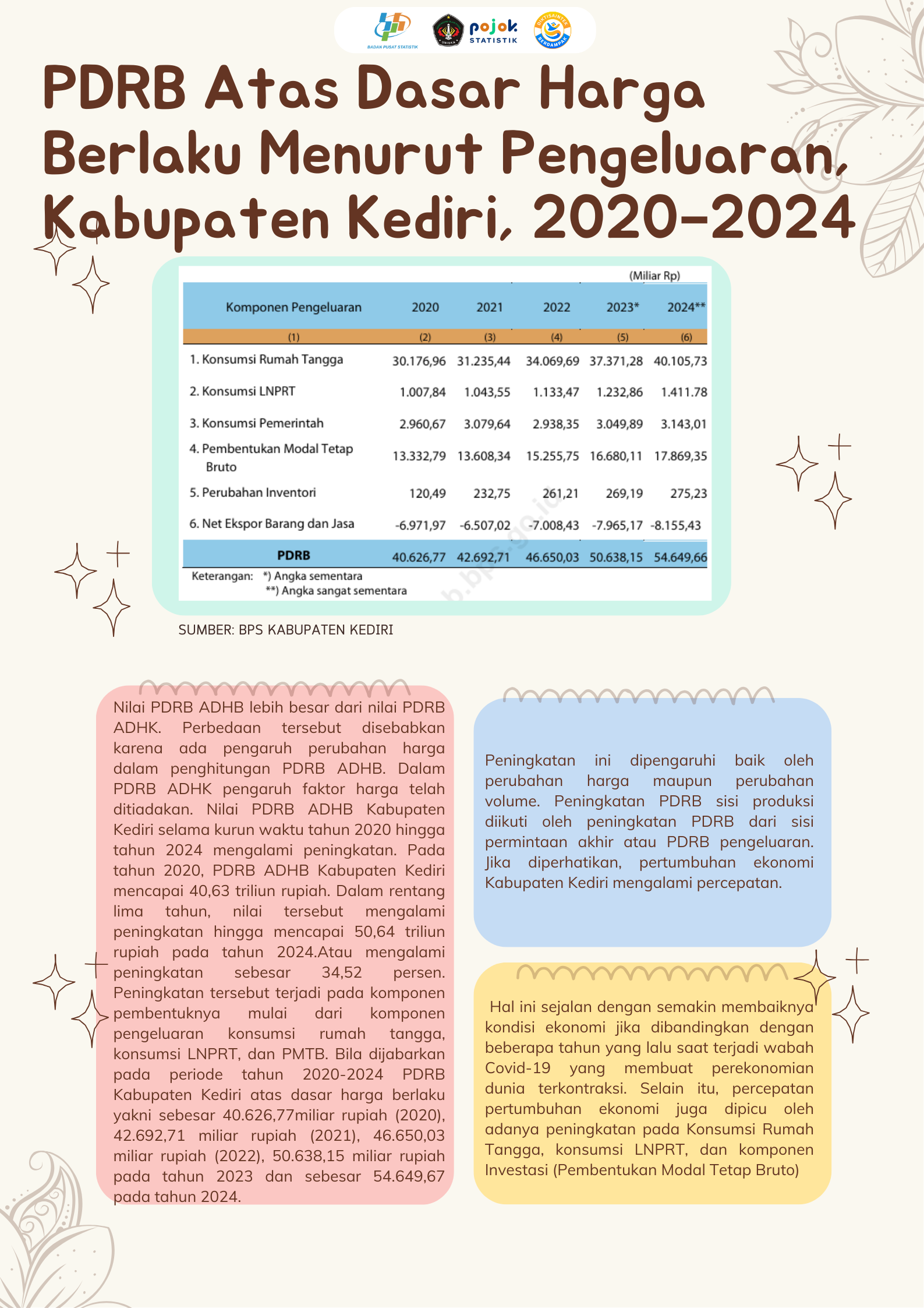 Selama periode 2020-2024, PDRB atas dasar harga berlaku di Kabupaten Kediri cenderung mengalami peningkatan setiap tahun, meskipun sempat mengalami kemerosoton pada saat pandemi Covid-19 pada...