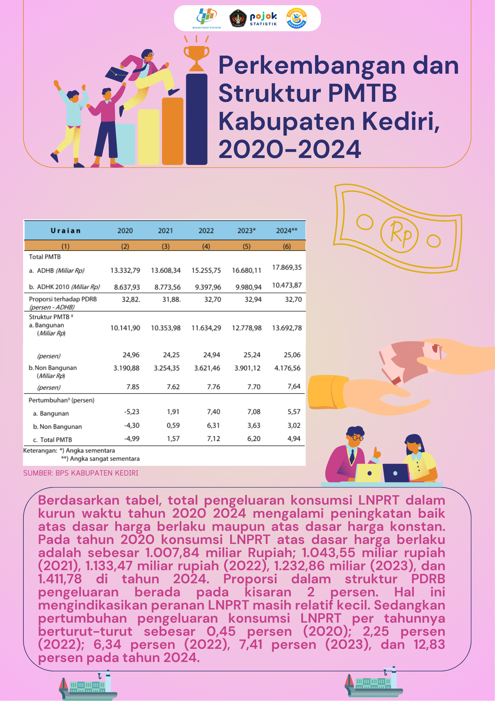 Berdasarkan tabel, total pengeluaran konsumsi LNPRT dalam kurun waktu tahun 2020 2024 mengalami peningkatan baik atas dasar harga berlaku maupun atas dasar harga konstan. Pada...