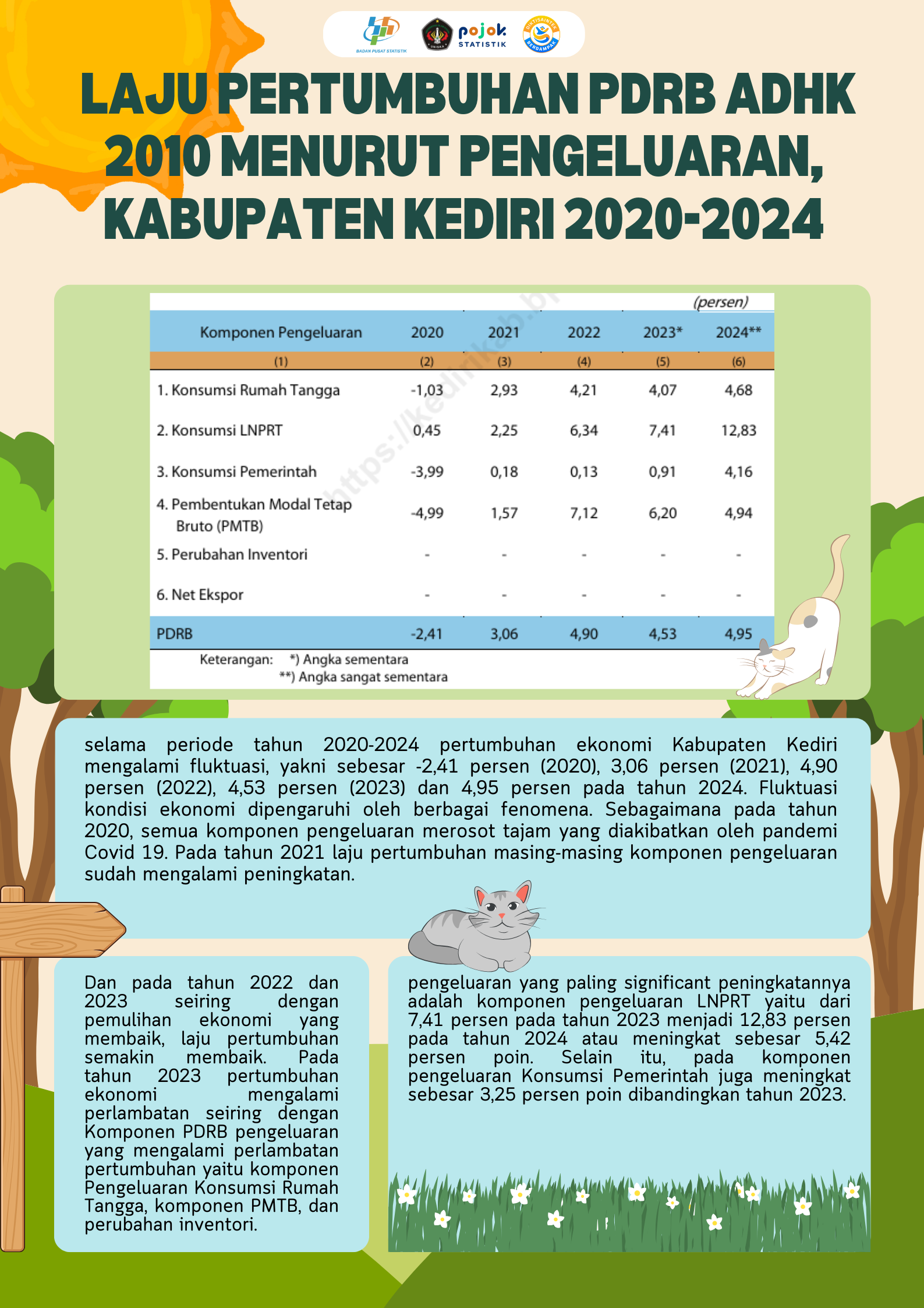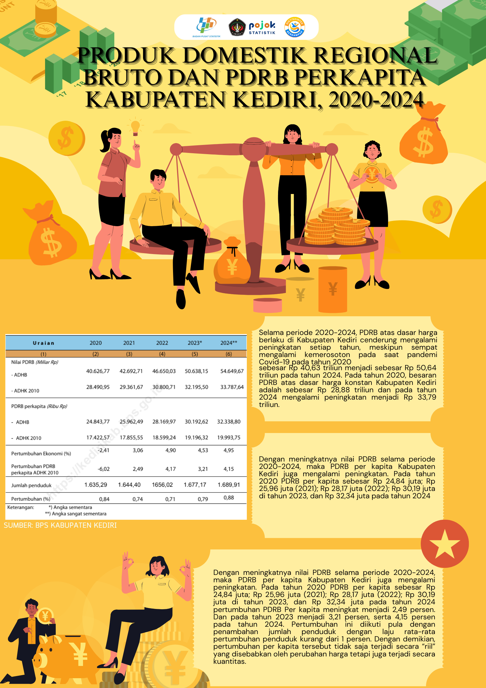selama periode tahun 2020-2024 pertumbuhan ekonomi Kabupaten Kediri mengalami fluktuasi, yakni sebesar -2,41 persen (2020), 3,06 persen (2021), 4,90 persen (2022), 4,53 persen (2023) dan...