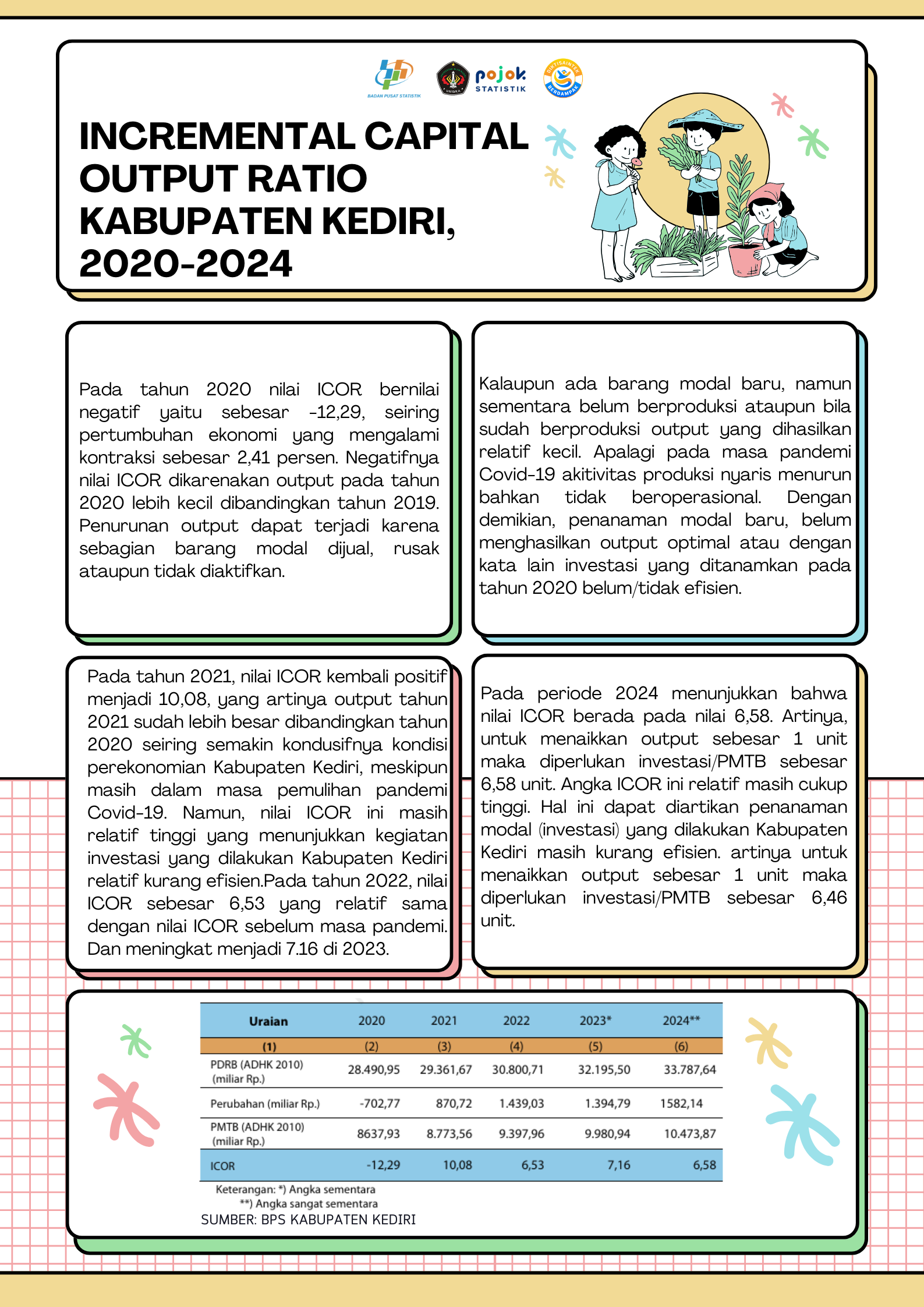 Pada tahun 2020 nilai ICOR bernilai negatif yaitu sebesar -12,29, seiring pertumbuhan ekonomi yang mengalami kontraksi sebesar 2,41 persen. Negatifnya nilai ICOR dikarenakan output pada...
