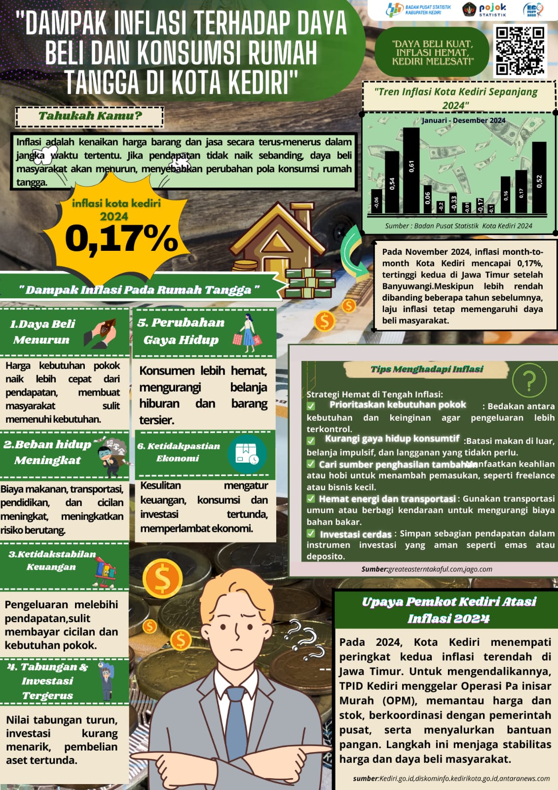 "Infografis yang saya buat ini menyajikan data inflasi di Kota Kediri secara visual dan informatif. Dengan grafik perbandingan, ikon ilustratif, serta tips menghadapi inflasi, infografis...