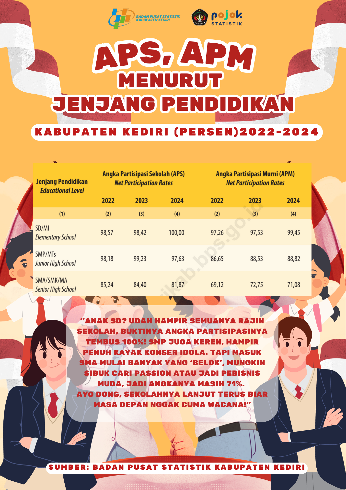 APS,APM Menurut jenjang pendidikan Kabupaten Kediri (persen) 2022-2024