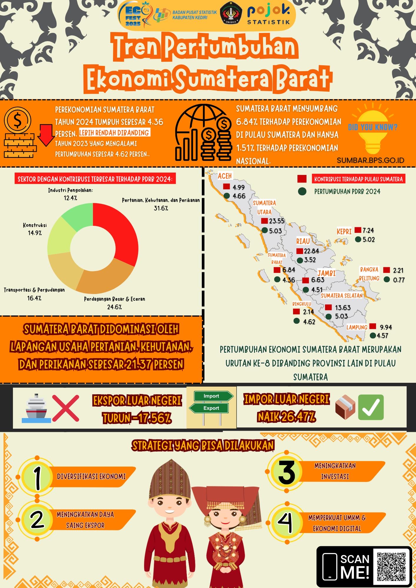 Infografis ini menampilkan Pertumbuhan Ekonomi Sumatera Barat Tahun 2024, yang tumbuh 4,36%, lebih rendah dibanding 2023 (4,62%). Data dari Badan Pusat Statistik (BPS) Sumatera Barat...