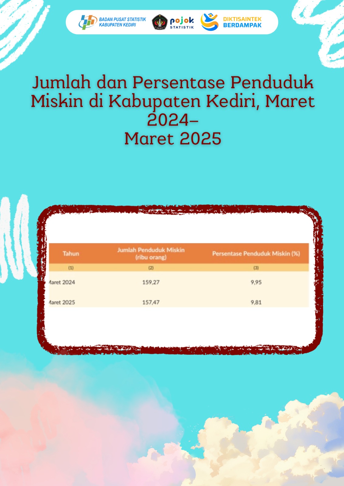 Infografis ini menunjukkan bahwa jumlah penduduk miskin di Kabupaten Kediri menurun dari 159,27 ribu orang (9,95%) pada Maret 2024 menjadi 157,47 ribu orang (9,81%) pada...