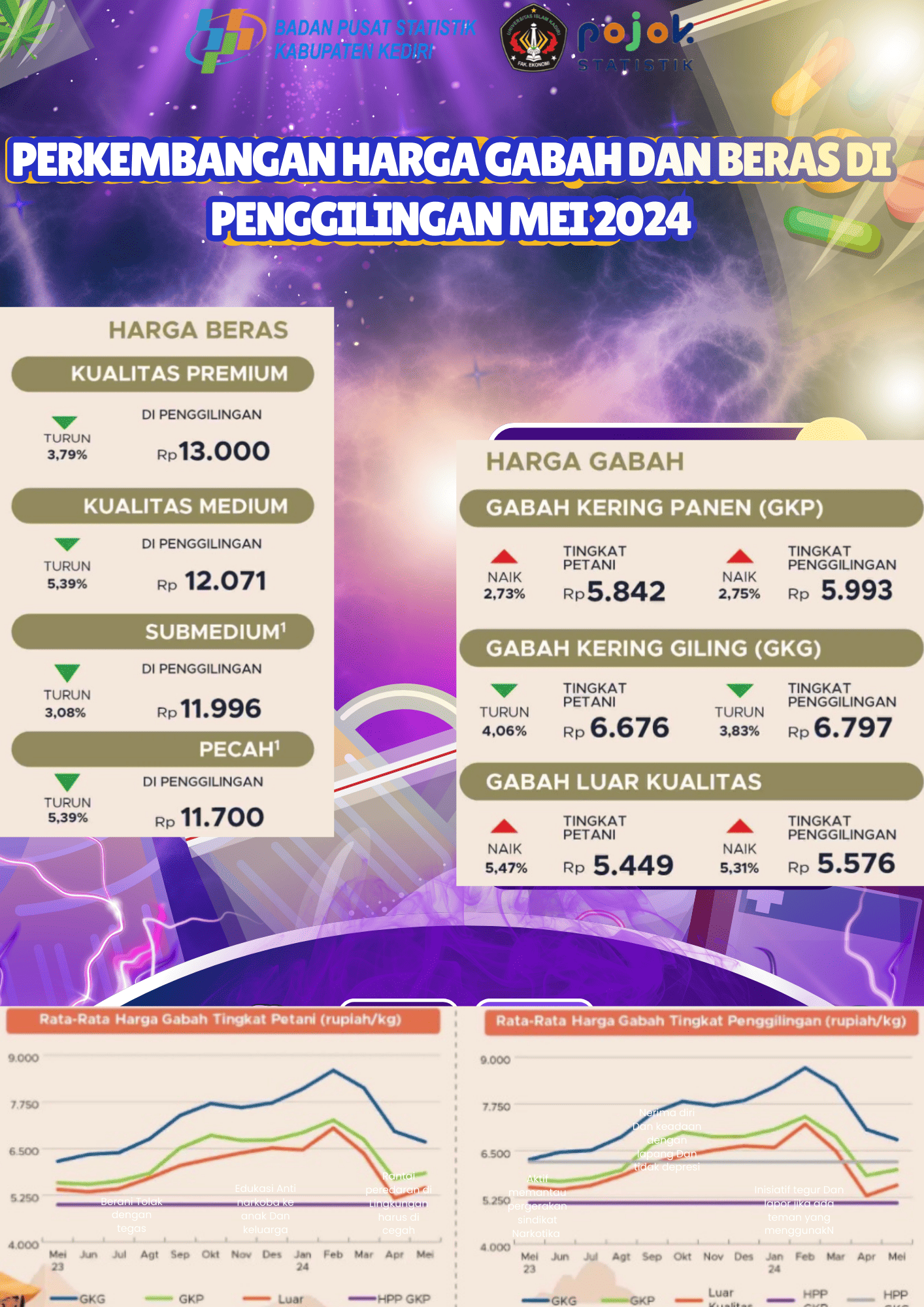 Infografis ini menampilkan perkembangan harga gabah dan beras pada Mei 2024, di mana harga beras di penggilingan cenderung turun, sementara harga gabah menunjukkan perubahan yang...