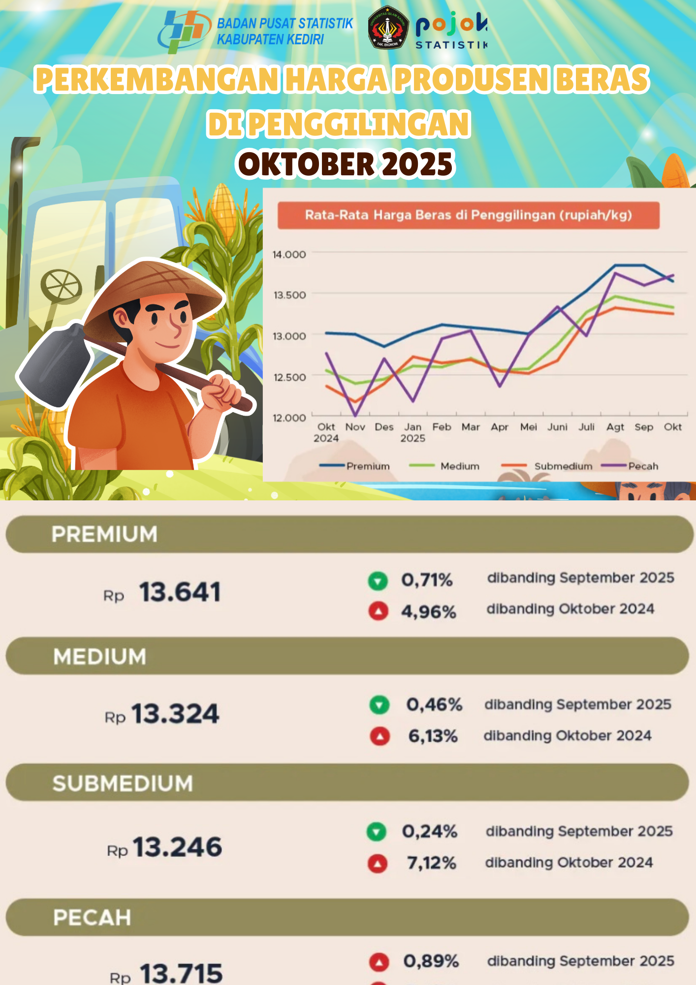 Harga produsen beras di penggilingan Kediri Oktober 2025 relatif stabil, dengan kenaikan tipis bulanan dan lebih tinggi dibanding Oktober 2024.