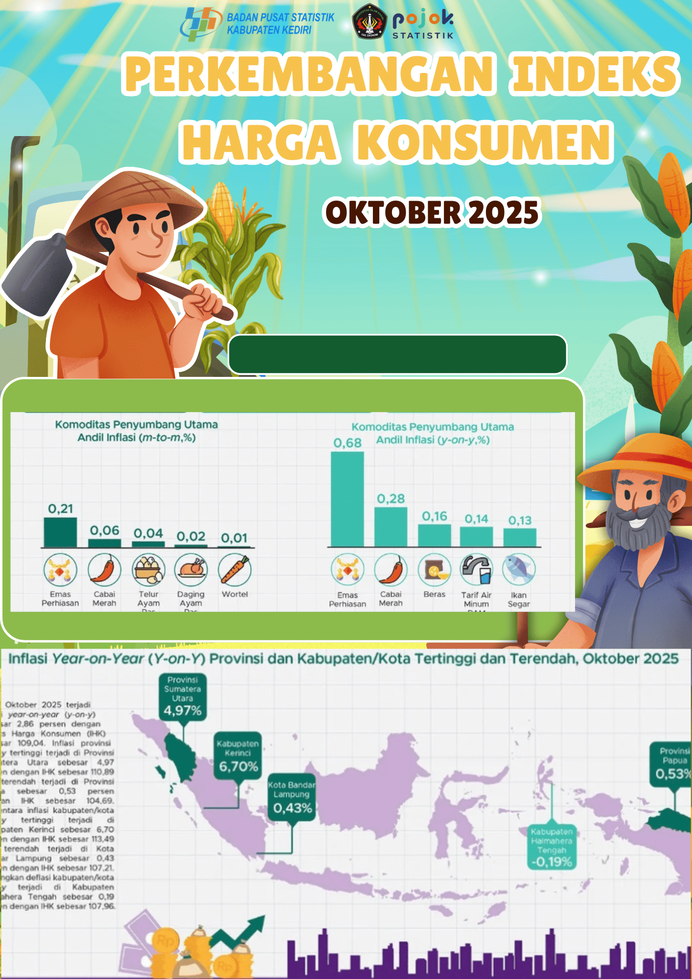 Infografis ini menampilkan perkembangan Indeks Harga Konsumen (IHK) Oktober 2025, termasuk komoditas utama penyumbang inflasi serta perbandingan inflasi year-on-year tertinggi dan terendah di provinsi serta...
