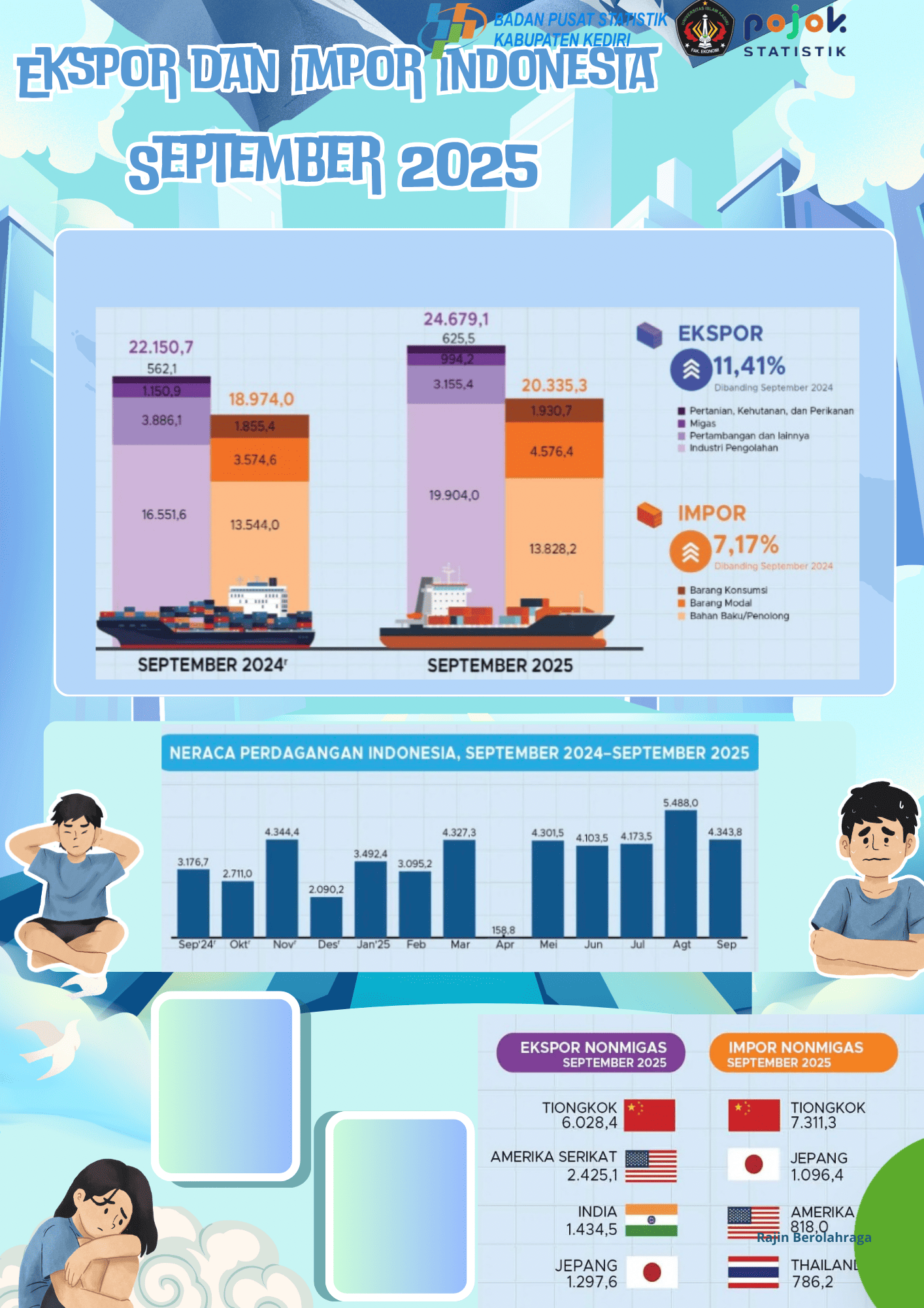 Pada September 2025, kinerja perdagangan Indonesia menunjukkan perbaikan, dengan ekspor tumbuh 11,41% dan impor meningkat 7,17% dibandingkan September 2024. Kenaikan ini mencerminkan aktivitas perdagangan yang...