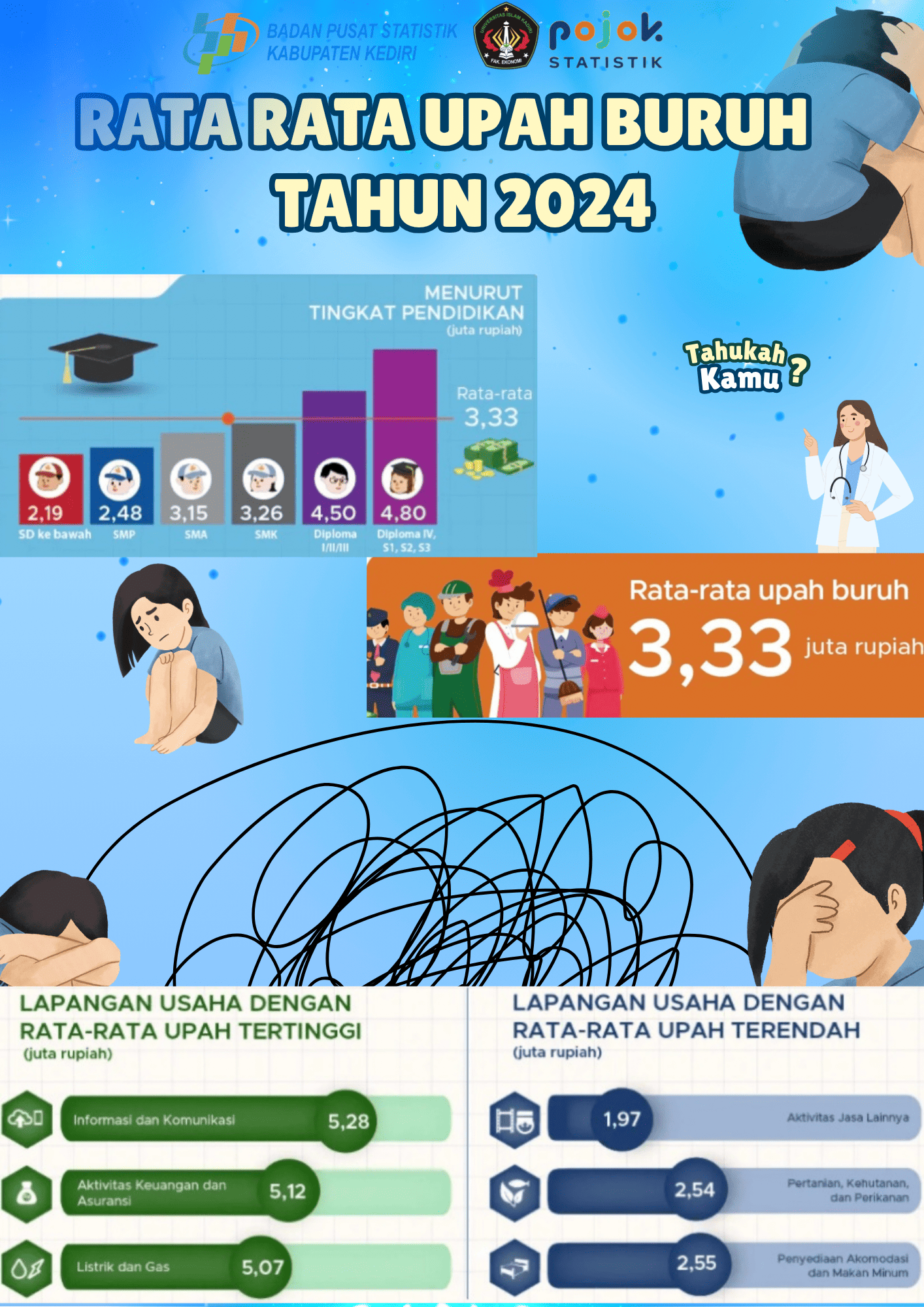 Infografis ini menunjukkan rata-rata upah buruh tahun 2024 sebesar 3,33 juta rupiah. Upah tertinggi diterima buruh dengan pendidikan Diploma IV/S1 ke atas serta pada lapangan...
