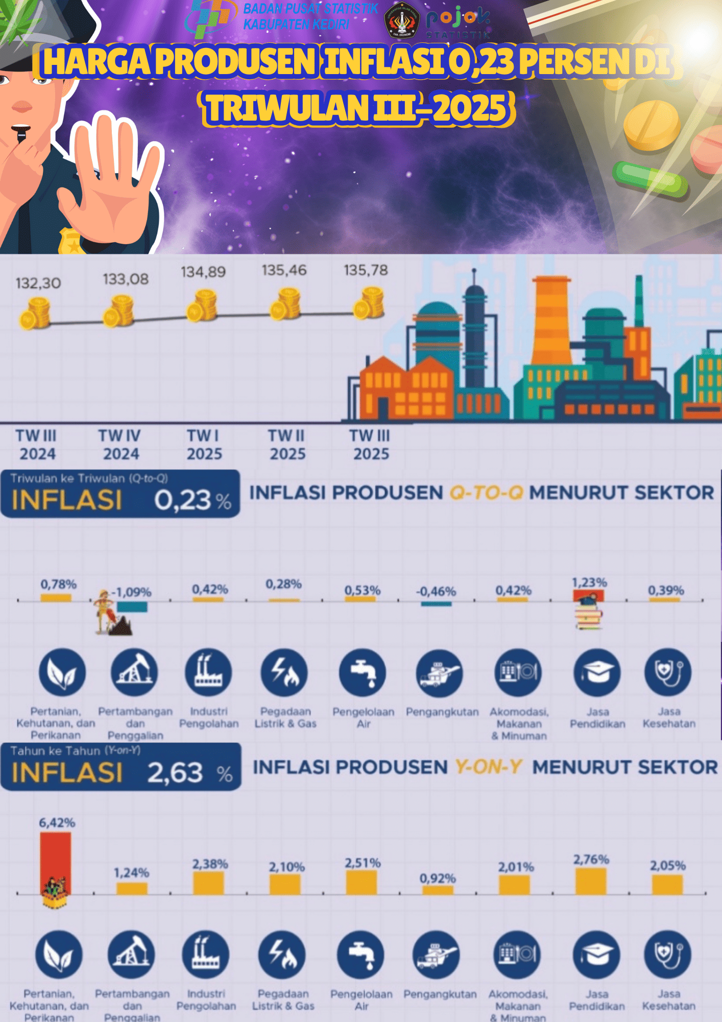 inflasi harga produsen Kabupaten Kediri sebesar 0,23% (q-to-q) pada Triwulan III 2025. Secara tahunan, inflasi produsen tercatat 2,63% (y-on-y), dengan variasi kenaikan dan penurunan harga...