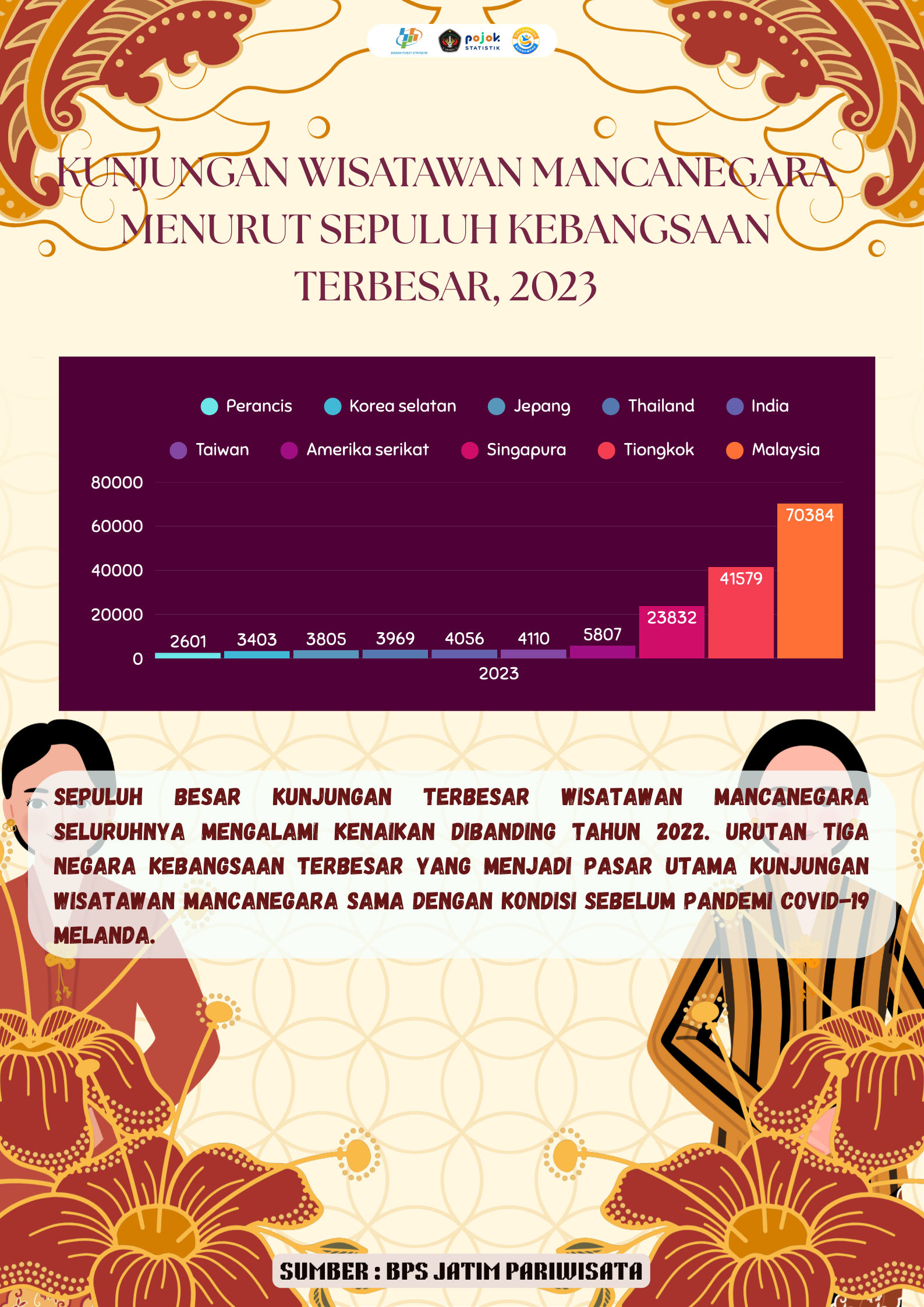 Sepuluh besar kunjungan wisatawan mancanegara seluruhnya mengalami kenaikan dibanding tahun 2022.