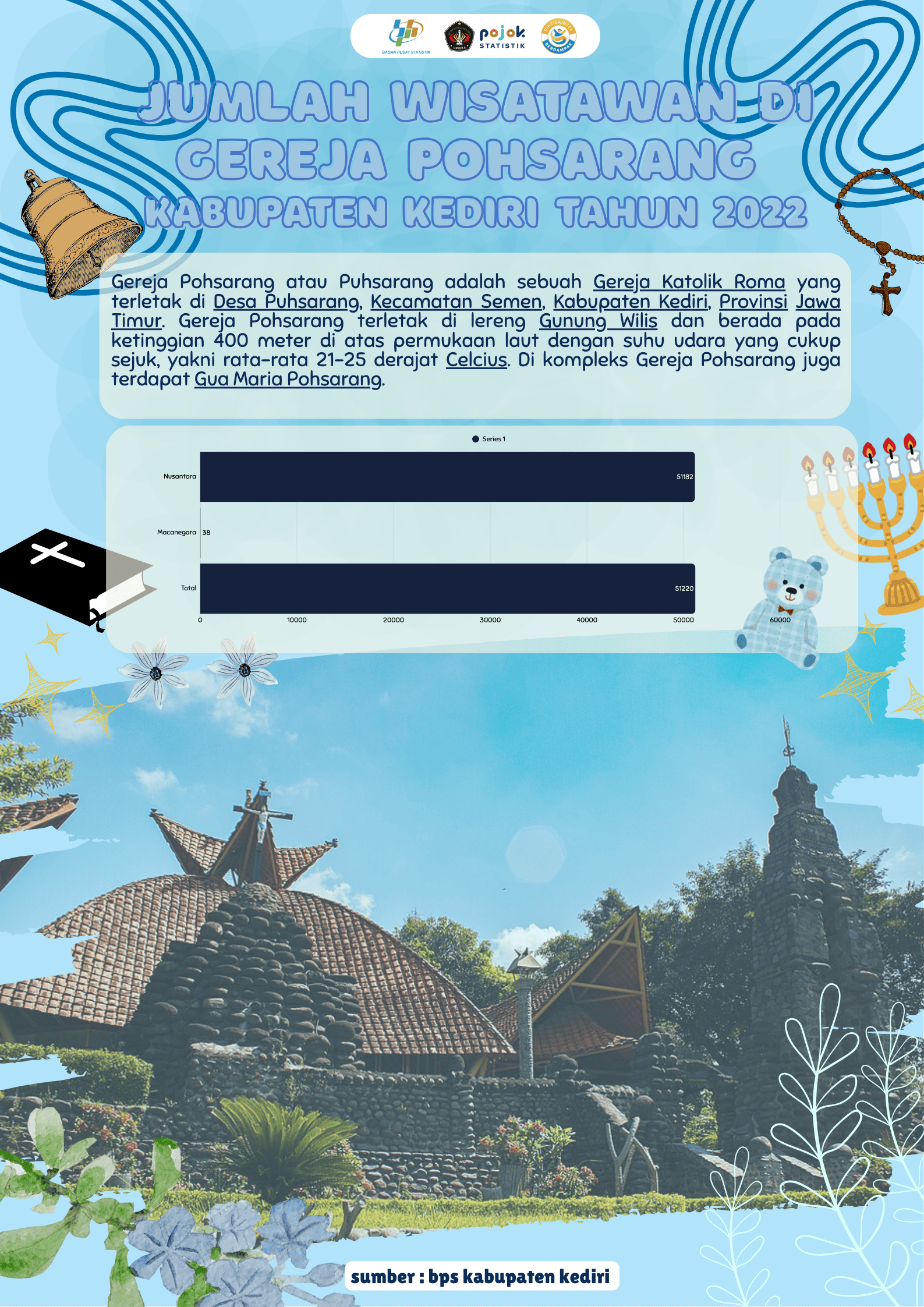 Gereja Pohsarang terletak di lereng Gunung Wilis dan berada pada ketinggian 400 MDPL dengan suhu udara yang cukup sejuk, yakni rata-rata 21-25 derajat celcius. Di...
