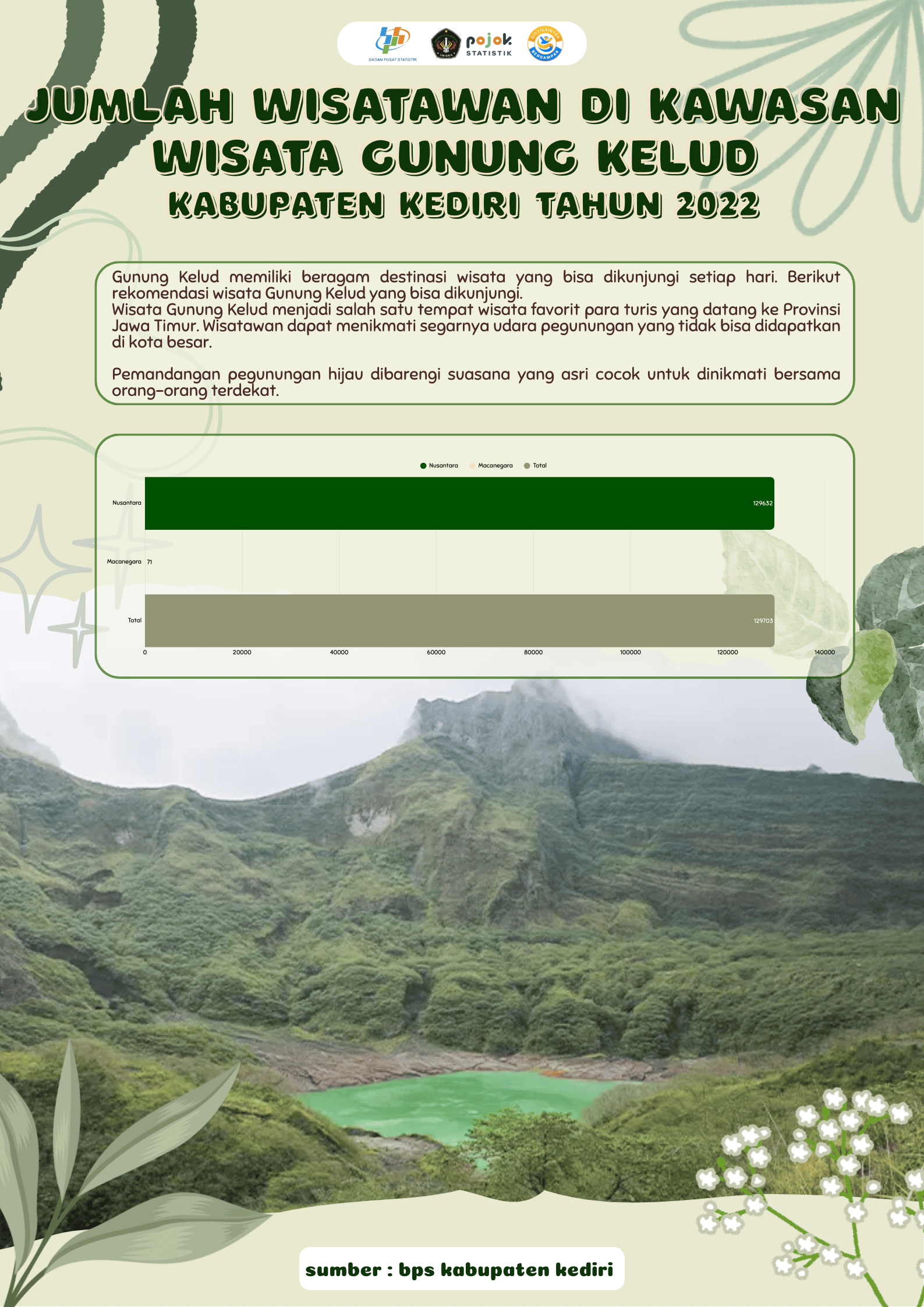 Gunung kelud memiliki beragam destinasi wisata yang bisa dikunjungi setiap hari.