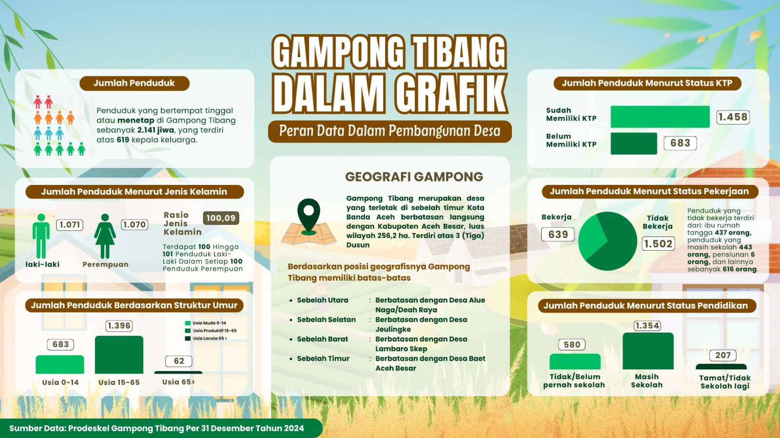 Menampilkan data kependudukan Gampong Tibang tahun 2024, meliputi jumlah penduduk (2.141 jiwa), distribusi jenis kelamin yang seimbang, struktur umur, status kepemilikan KTP, status pekerjaan, dan...