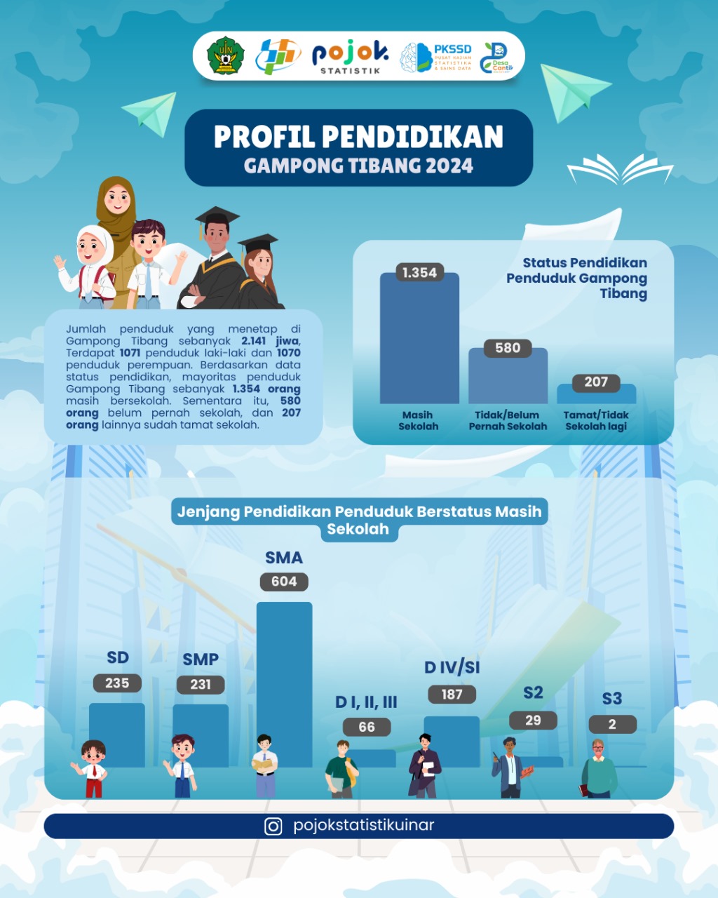 Menggambarkan kondisi pendidikan penduduk Gampong Tibang. Dari total penduduk, 1.354 orang masih sekolah, 580 belum atau tidak pernah sekolah, dan 207 sudah tamat. Distribusi jenjang...