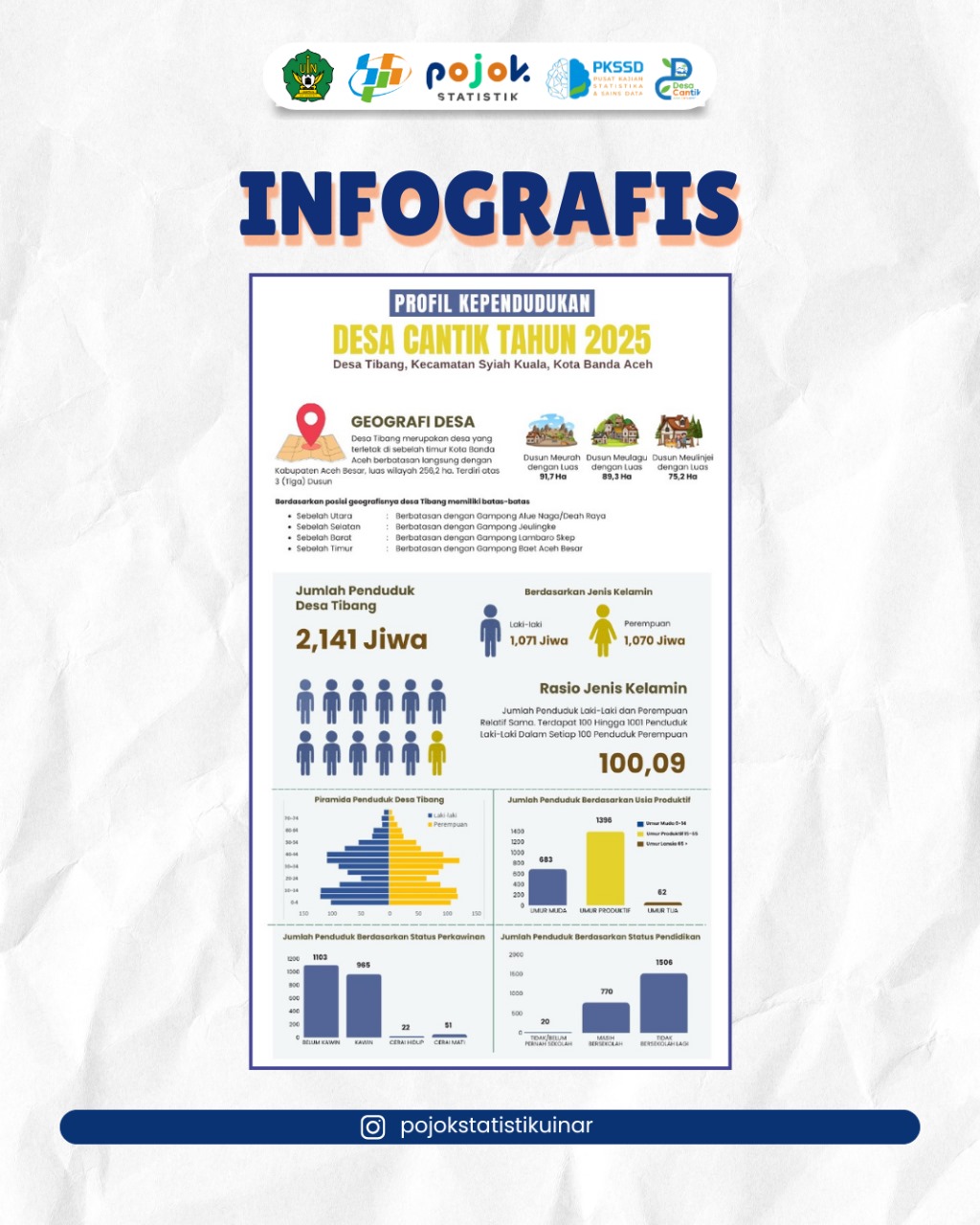 Memberikan gambaran umum kependudukan Desa Tibang tahun 2025. Jumlah penduduk 2.141 jiwa dengan rasio jenis kelamin hampir seimbang. Ditampilkan piramida penduduk, status perkawinan, struktur umur,...