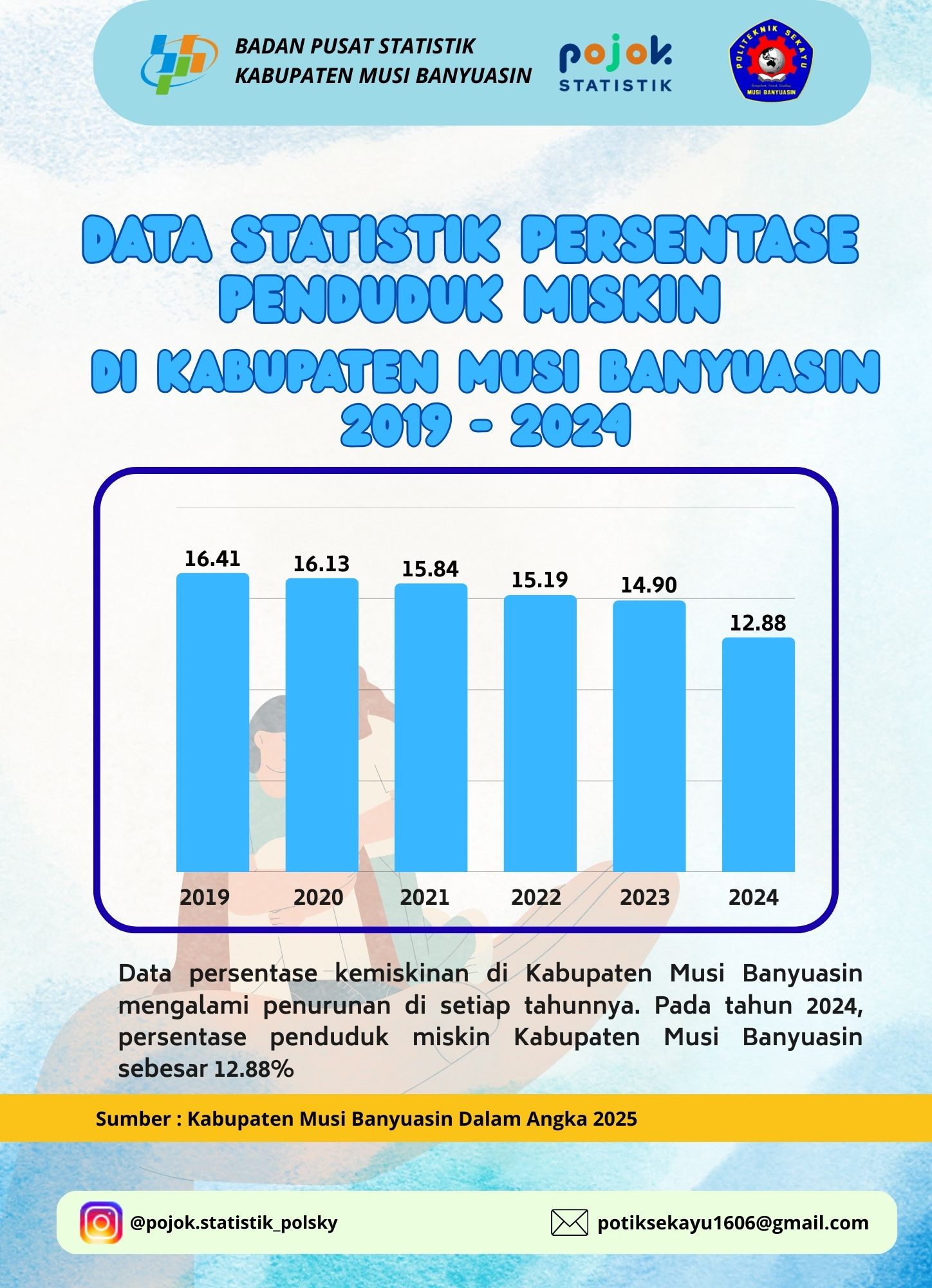 Data persentase kemiskinan di Kabupaten Musi Banyuasin mengalami penurunan di setiap tahunnya. Pada tahun 2024, persentase penduduk miskin Kabupaten Musi Banyuasin sebesar 12.88%
