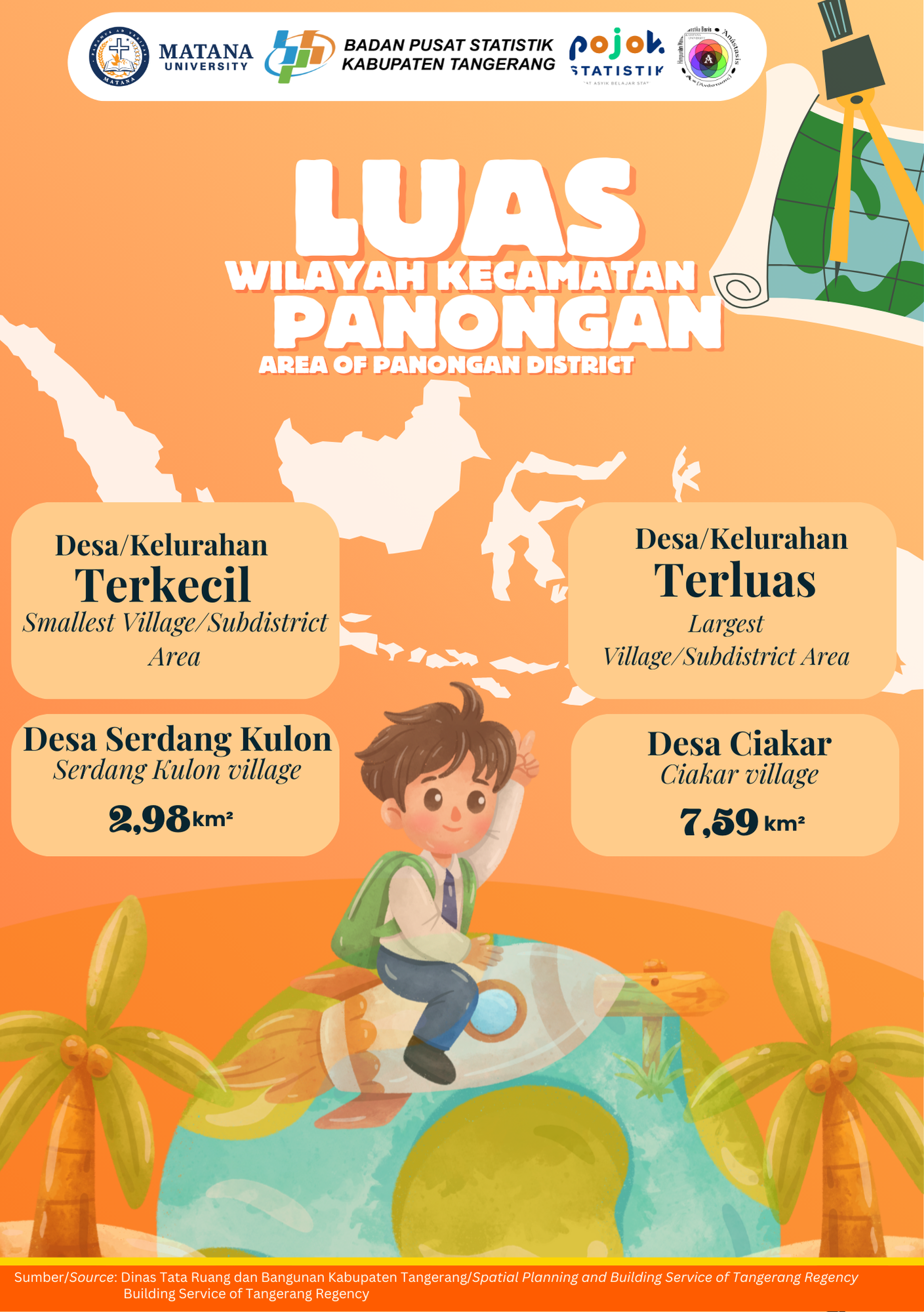Kecamatan Panongan memiliki variasi luas wilayah yang cukup beragam antar desa/kelurahan. Desa Serdang Kulon menjadi wilayah terkecil dengan luas 2,98 km², sedangkan Desa Ciakar merupakan...