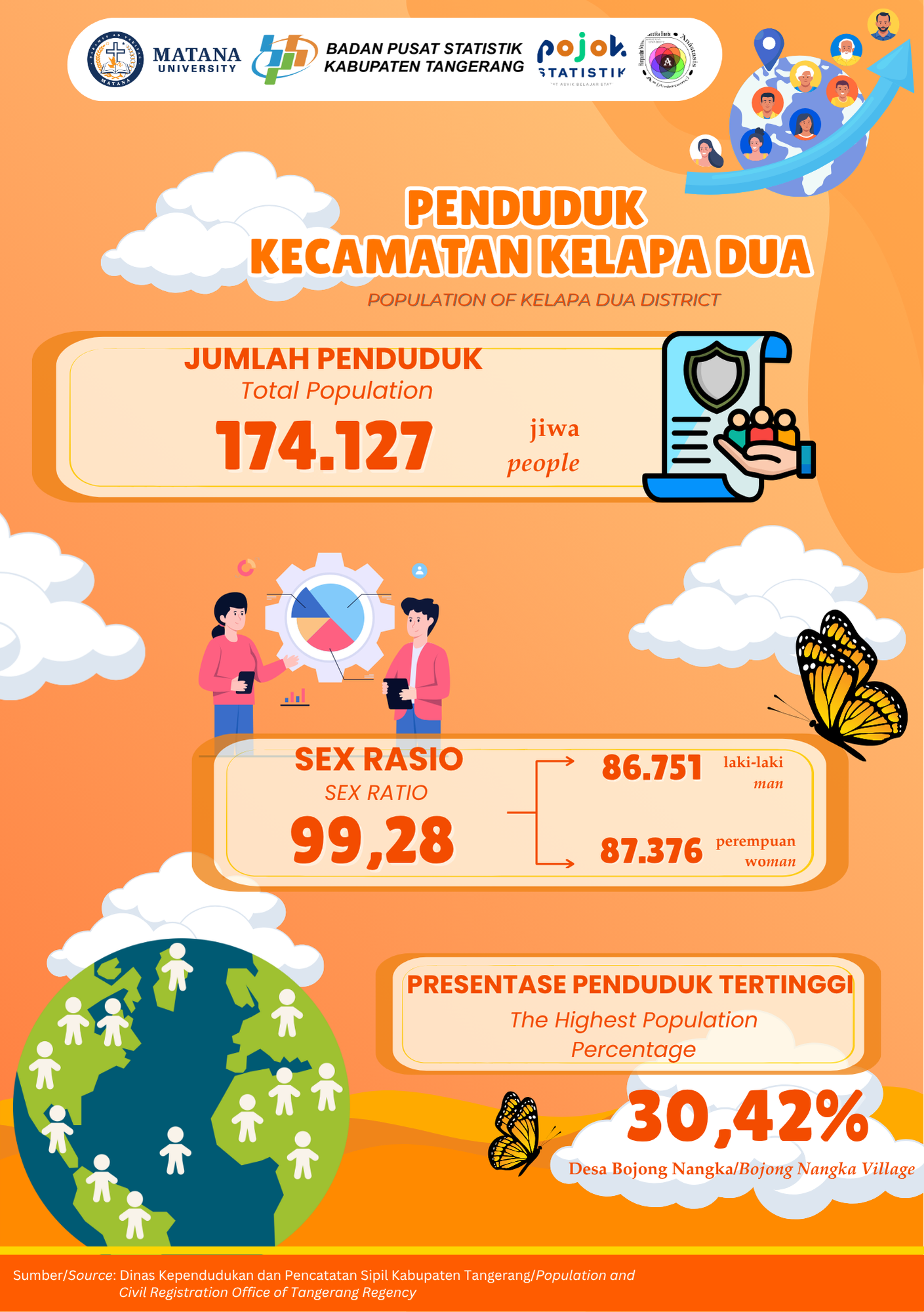 Kecamatan Kelapa Dua memiliki total penduduk sebanyak 174.127 jiwa, terdiri dari 86.751 laki-laki dan 87.376 perempuan. Rasio jenis kelamin atau sex ratio sebesar 99,28 menunjukkan...