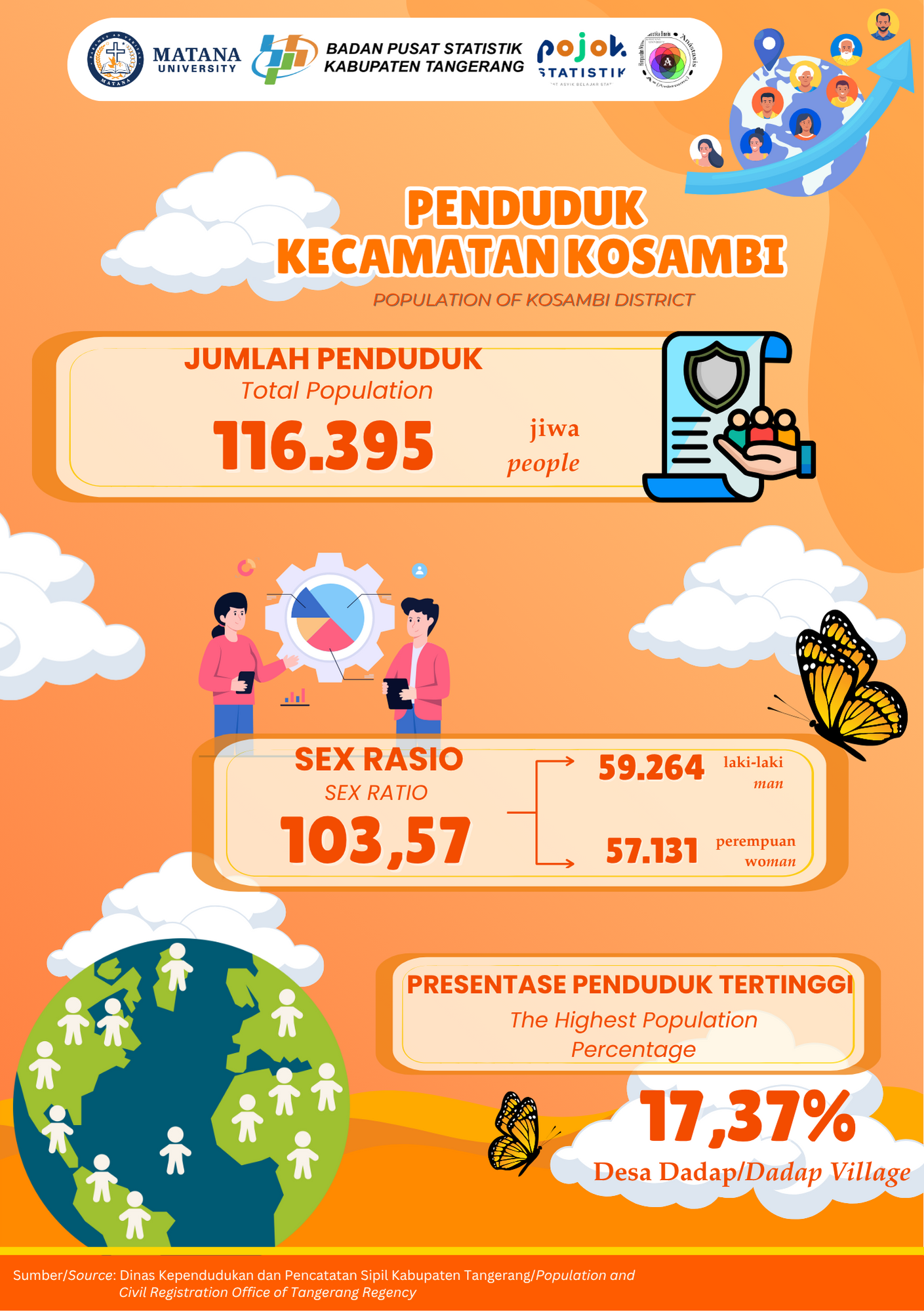 Kecamatan Kosambi dihuni oleh 116.395 jiwa, terdiri atas 59.264 laki-laki dan 57.131 perempuan, dengan sex ratio sebesar 103,57 yang menunjukkan bahwa jumlah laki-laki sedikit lebih...