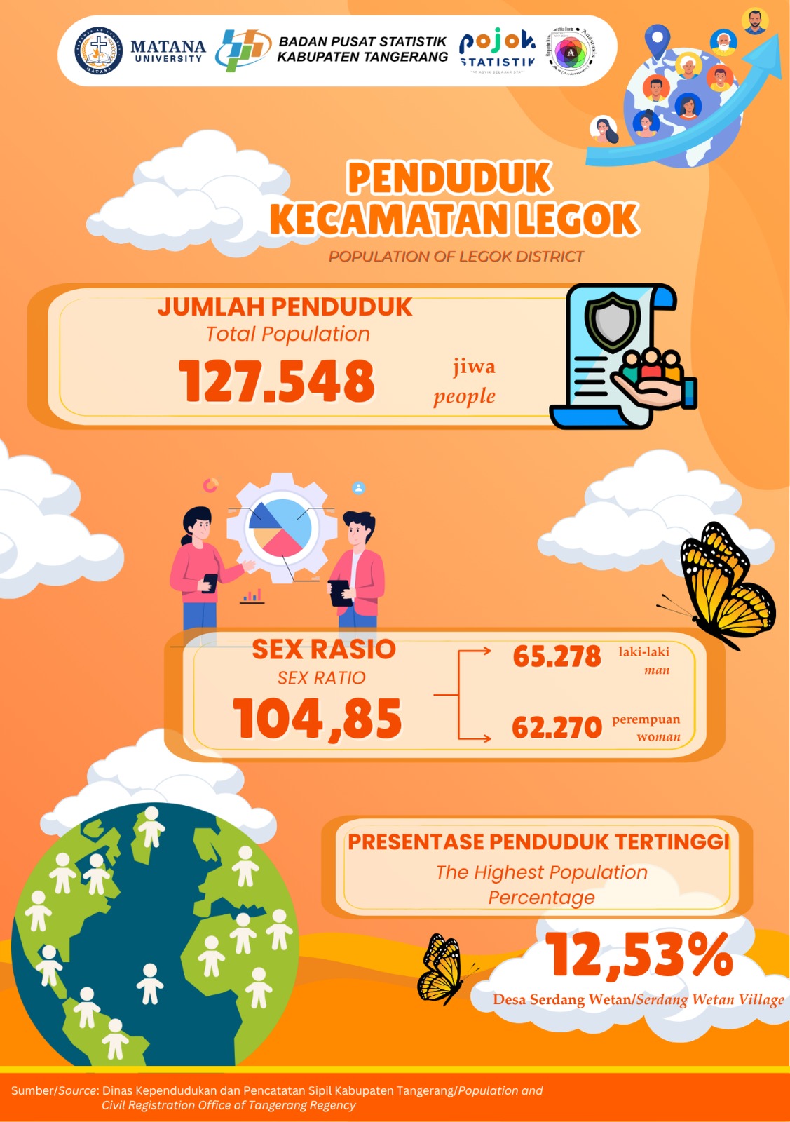 Kecamatan Legok memiliki jumlah penduduk sebanyak 127.548 jiwa dengan 65.278 laki-laki dan 62.270 perempuan. Rasio jenis kelamin (sex ratio) sebesar 104,85 menunjukkan bahwa jumlah penduduk...