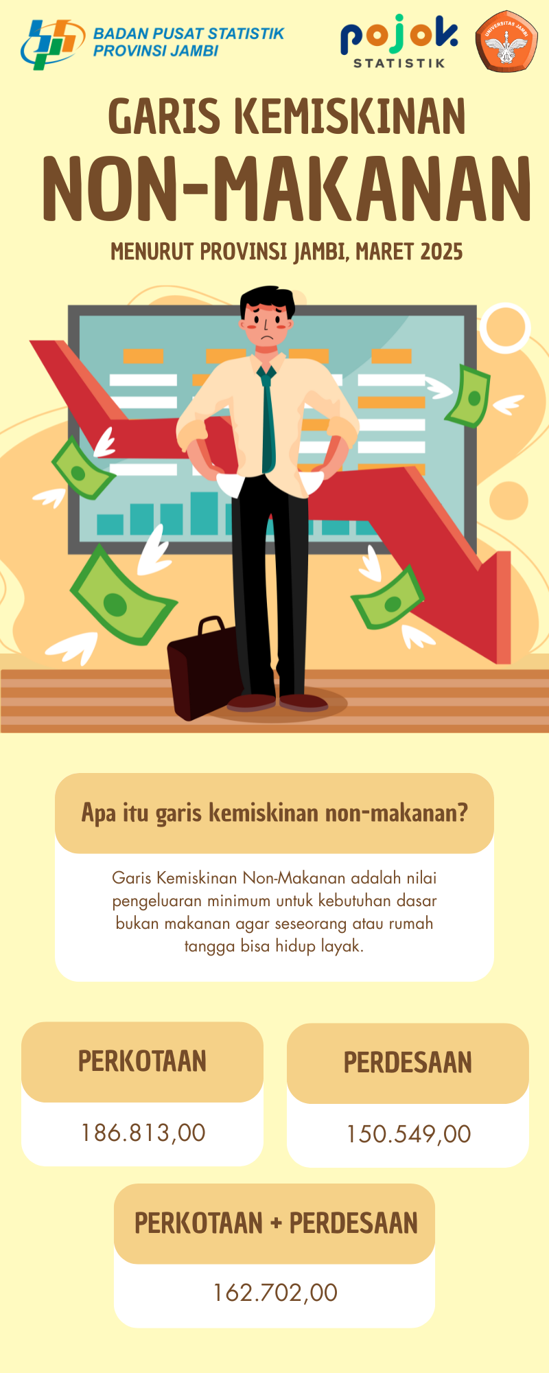 Garis kemiskinan non makanan di Provinsi Jambi pada Maret 2025 dapat dilihat pada infografis berikut. Garis kemiskinan non makanan perkotaan lebih tinggi dari pedesaan.