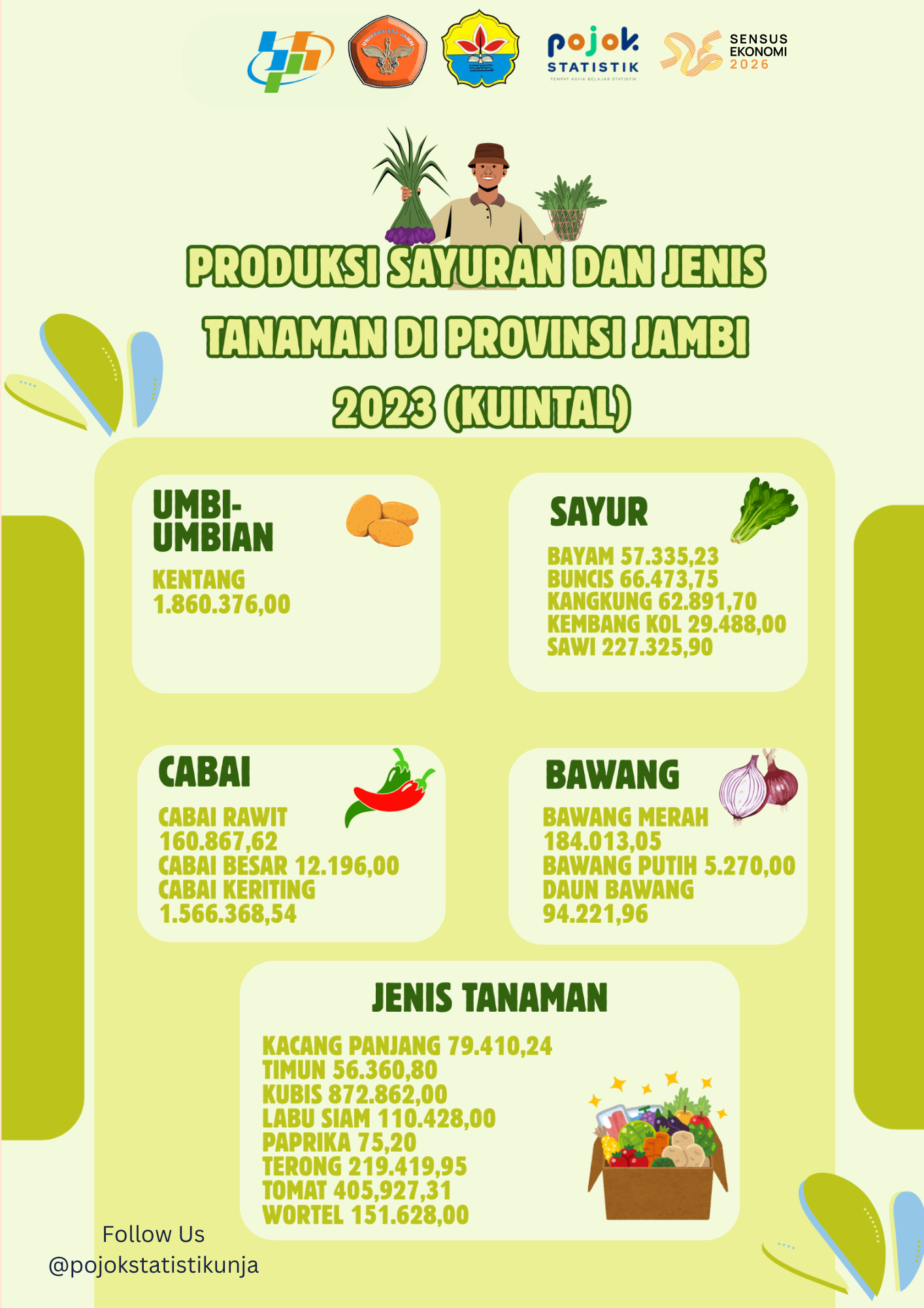 Infografis menampilkan produksi sayuran di Provinsi Jambi pada tahun 2023. Disajikan data produksi sayur, cabai, bawang dan juga umbi - umbian.