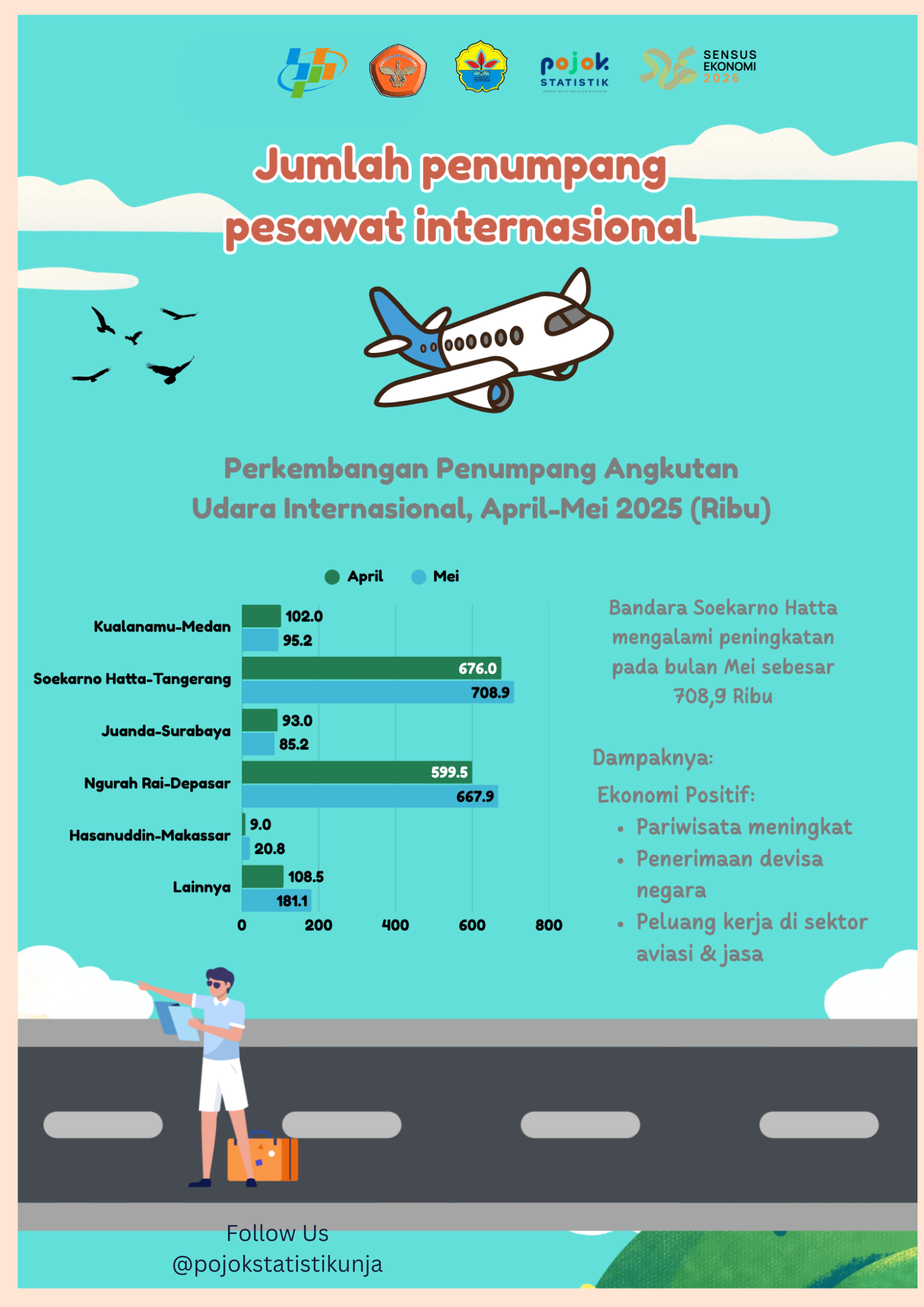 Infografis berisi perkembangan penumpang nngkutan udara atau pesawat di Indonesia pada periode April-Mei 2025. Data jumlah penumpang pesawat terekam pada bandara Soekarno Hatta