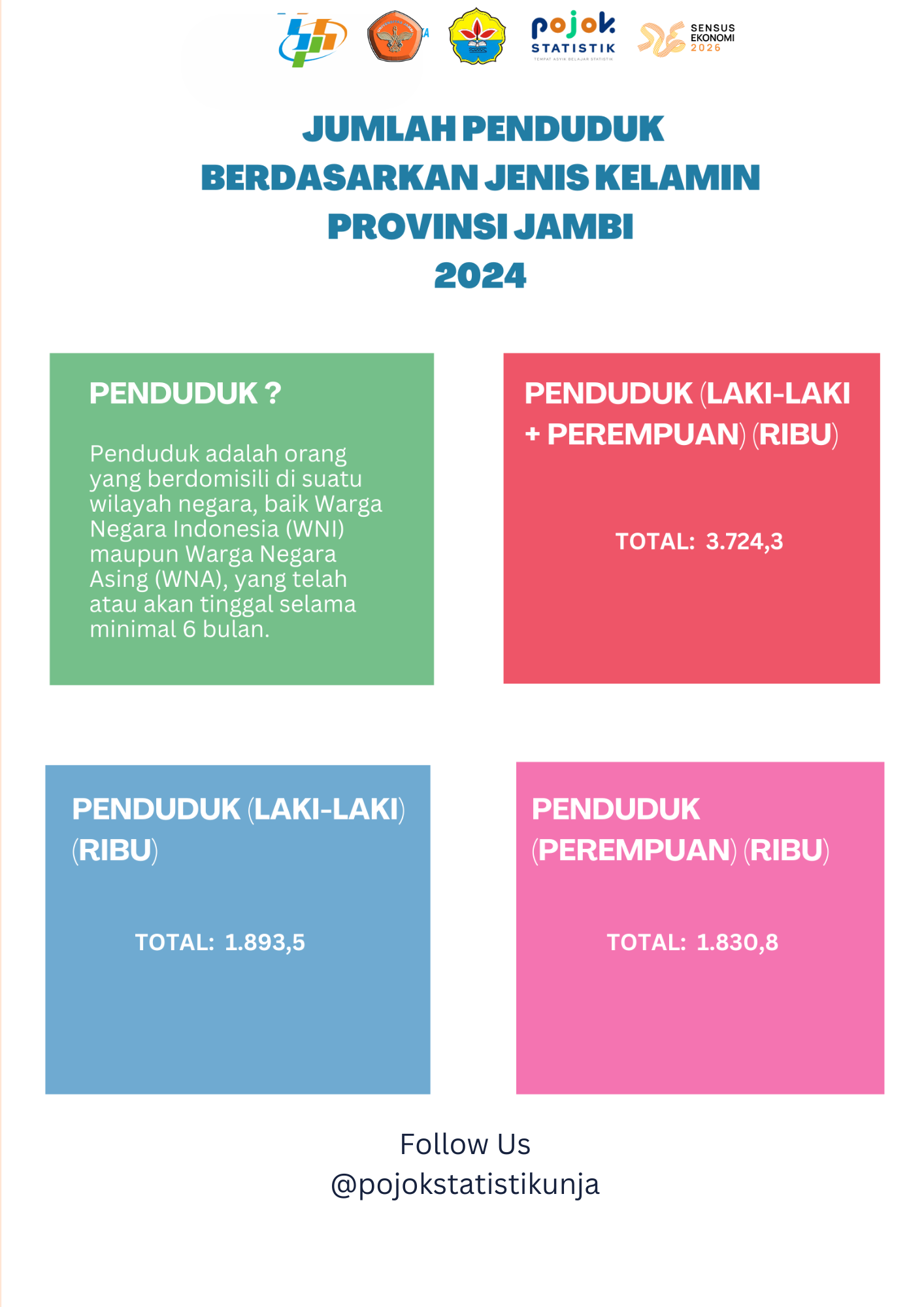 Tahukah kamu bahwa penduduk laki - laki terpotret lebih banyak dibanding penduduk perempuan. Jumlah penduduk laki - laki di Provinsi Jambi mencapai 1,89 juta orang.