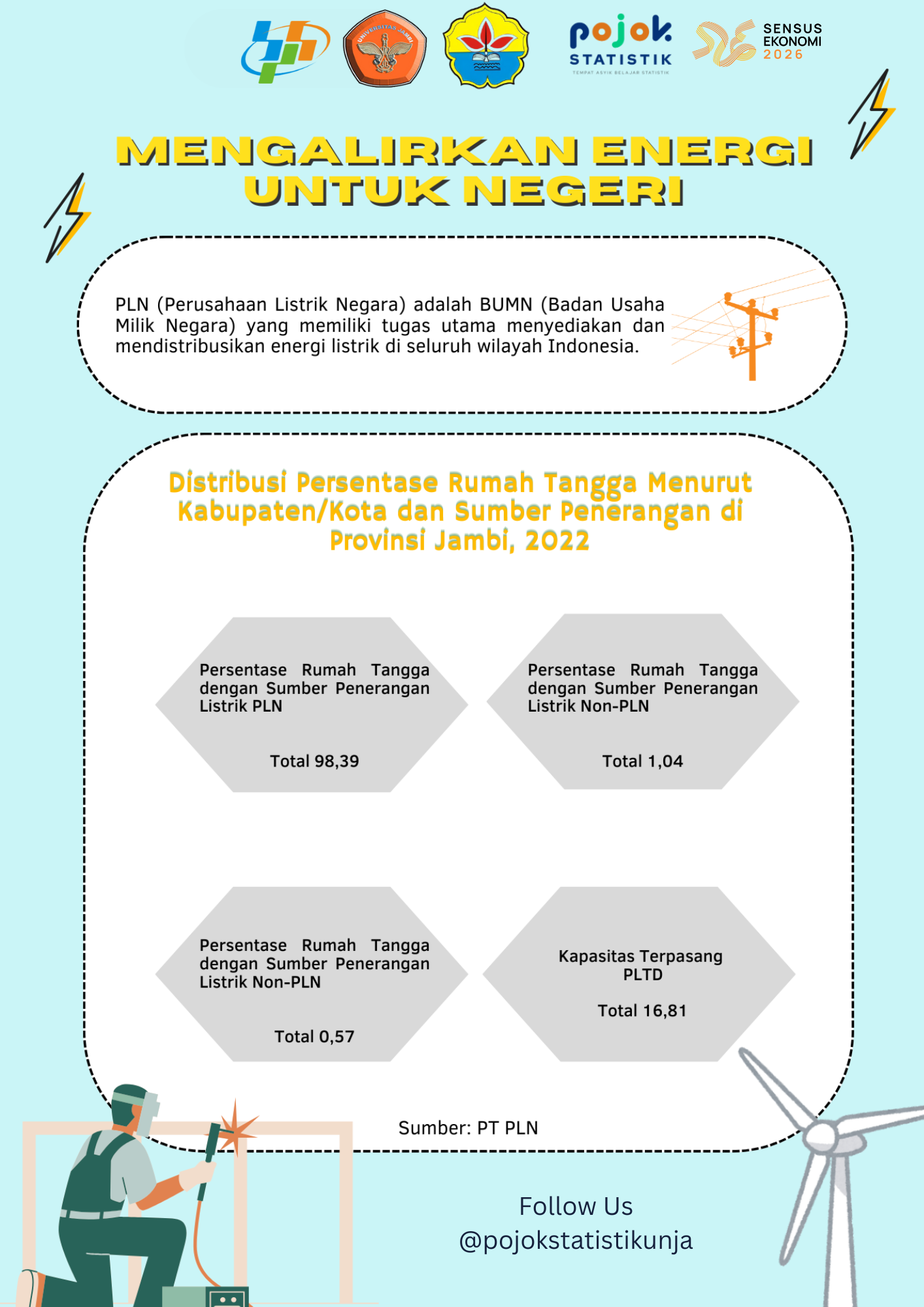 Infografis menyajikan distribusi persentase rumah tangga menurut sumber penerangan di Provinsi Jambi pada tahun 2022.