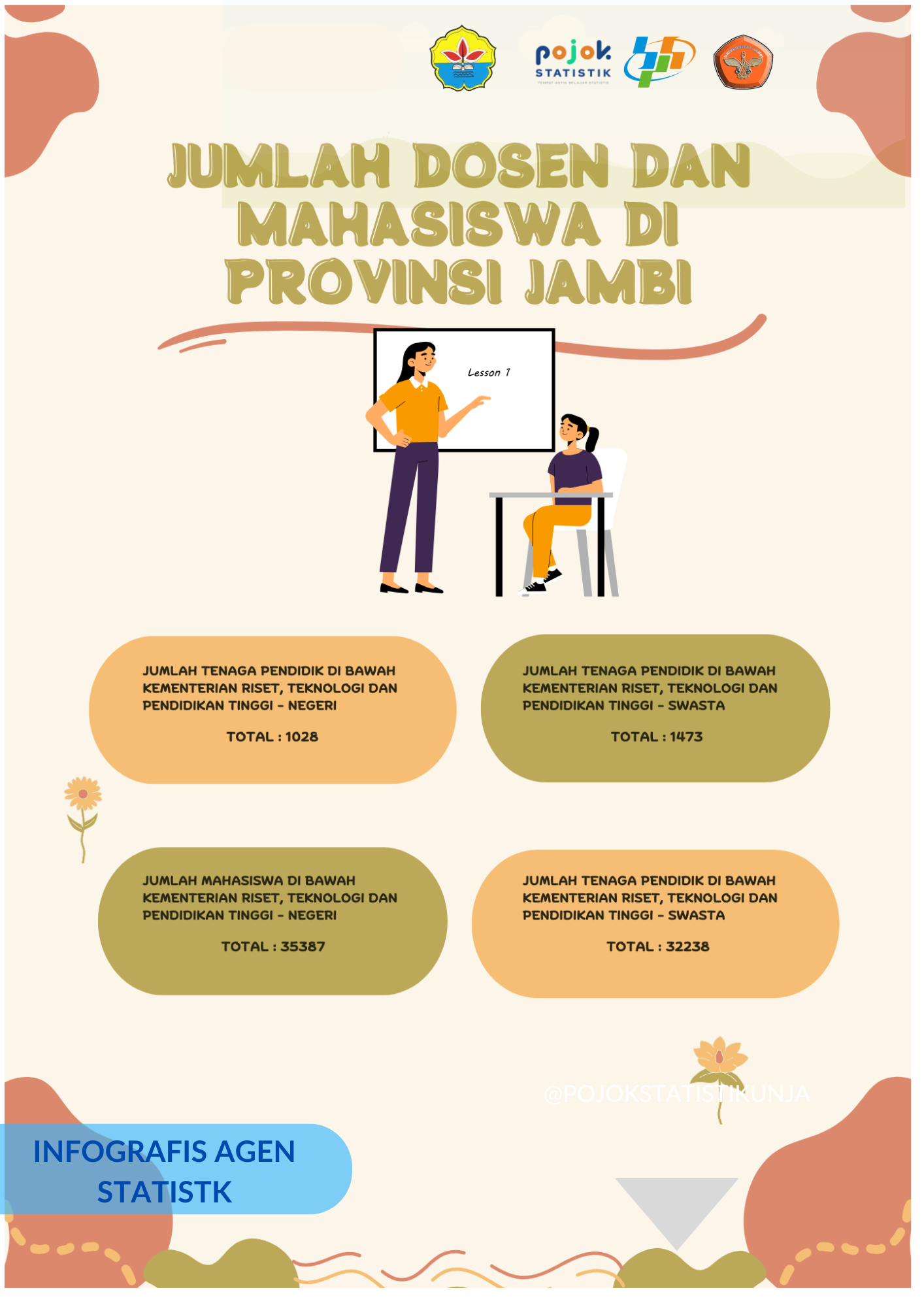 Infografis berisi jumlah dosen dan mahasiswa di Provinsi Jambi pada tahun 2024. Dijelaskan menurut status perguruan tinggi baik negeri maupun swasta.