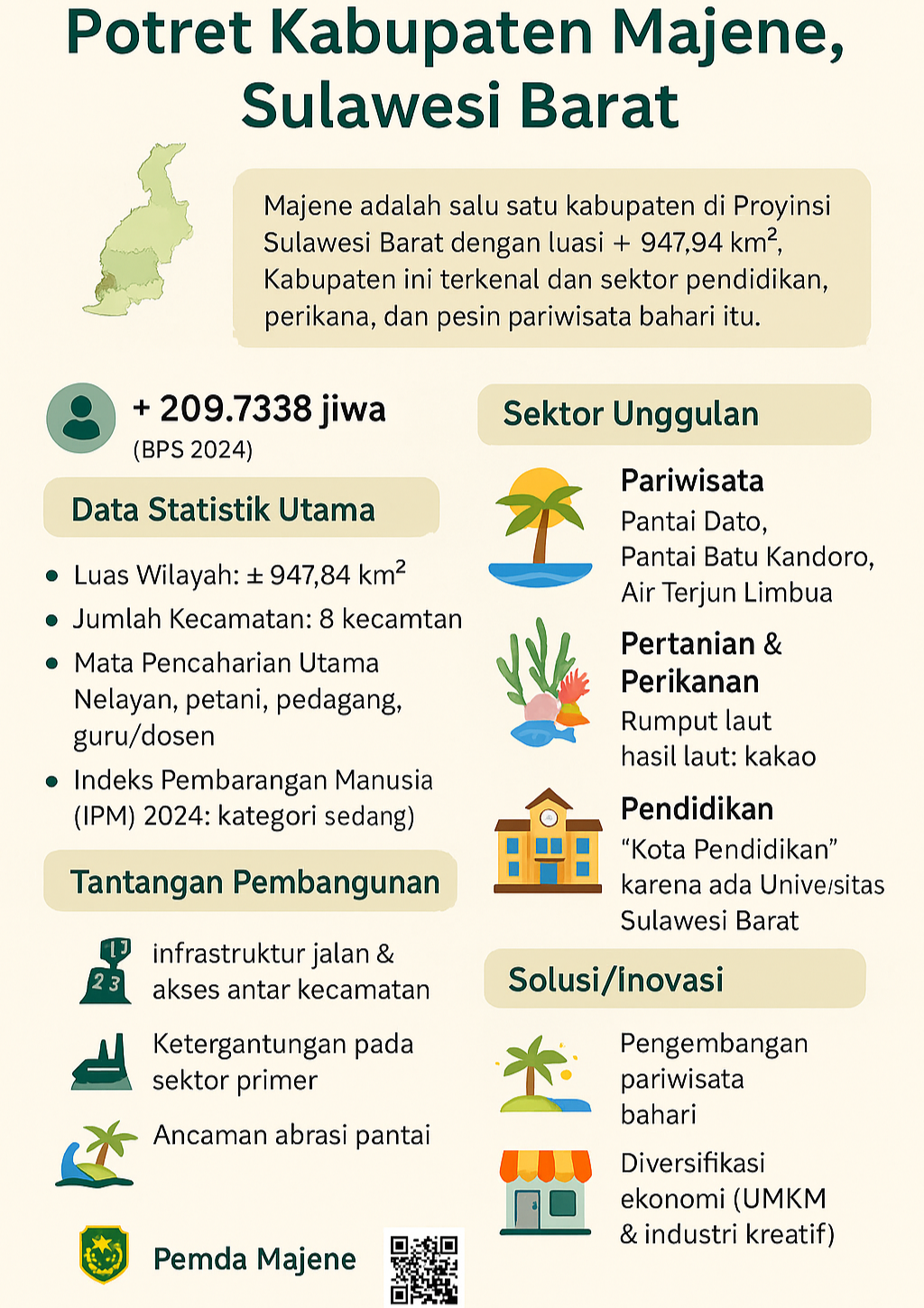 Kabupaten Majene, Sulawesi Barat Majene memiliki luas wilayah ±947,84 km² dengan penduduk sekitar 209,7 ribu jiwa (BPS 2024). Dikenal sebagai “Kota Pendidikan”, Majene juga unggul...