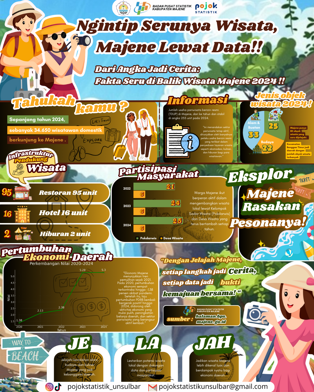 Infografis ini menggambarkan serunya wisata Majene tahun 2024, mulai dari jumlah kunjungan wisatawan, ragam objek wisata alam, budaya, dan buatan, hingga dukungan restoran, hotel, dan...