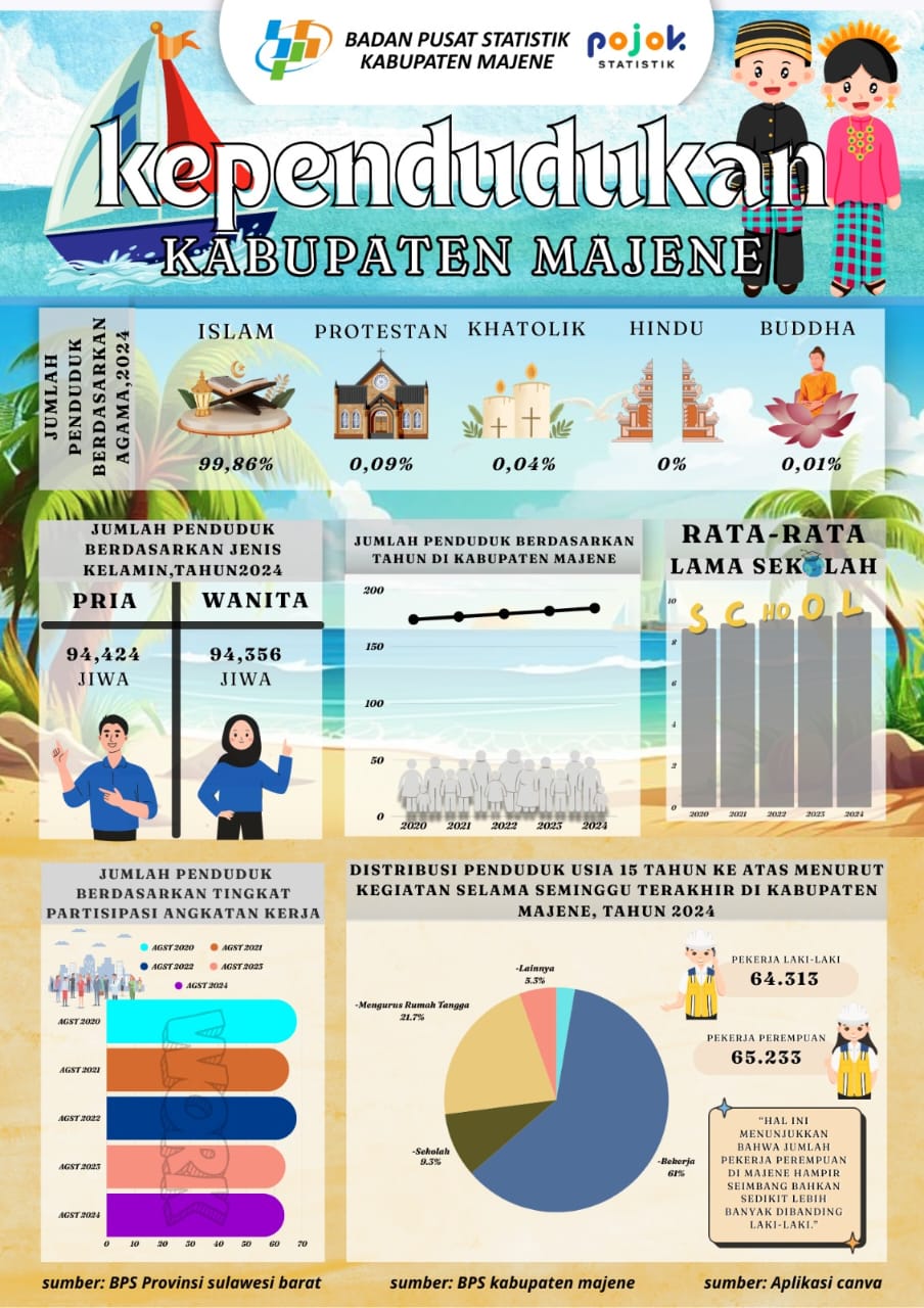 Demografi penduduk Majene 2024 menurut agama, jenis kelamin, rata-rata lama sekolah, jumlah penduduk, tingkat partisipasi angkatan kerja dan distribusi penduduk menurut aktifitas seminggu terakhir