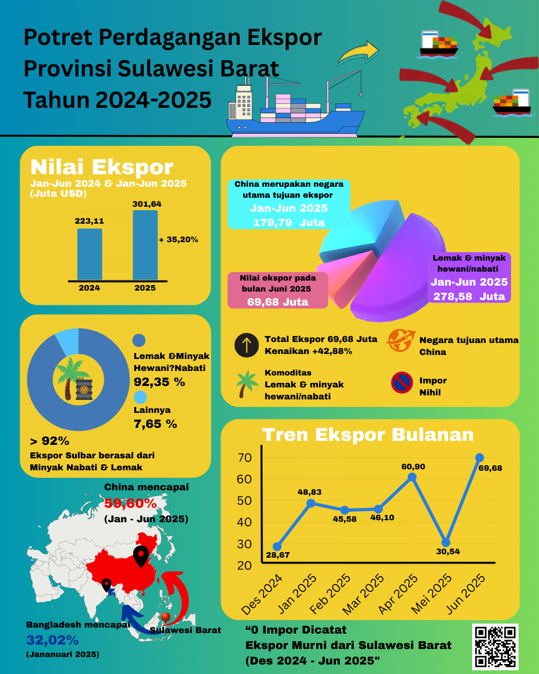 Infografis ini menampilkan potret kinerja ekspor Provinsi Sulawesi Barat periode 2024–2025 yang menunjukkan tren pertumbuhan positif. Nilai ekspor Jan–Jun 2025 meningkat signifikan dibandingkan periode yang...