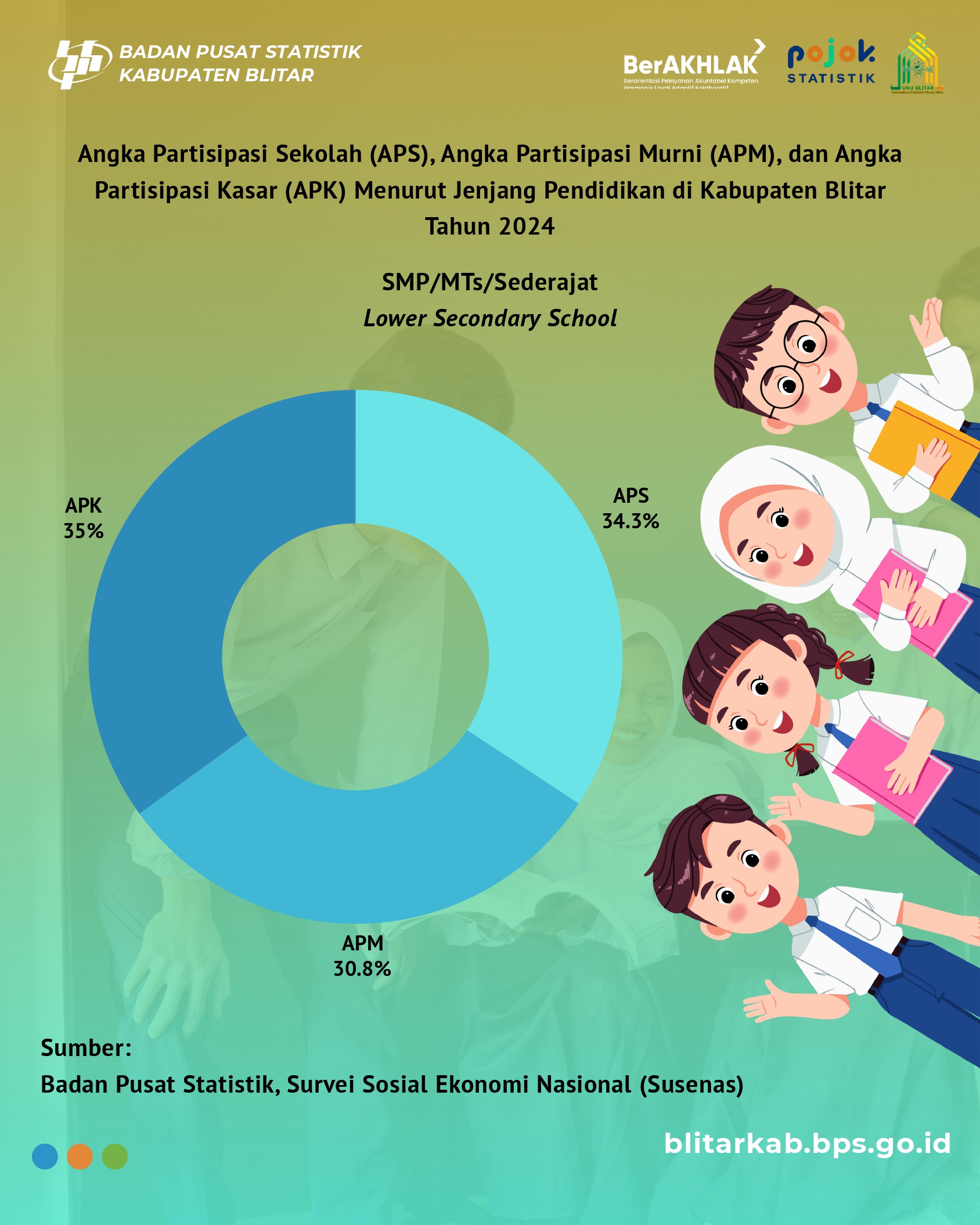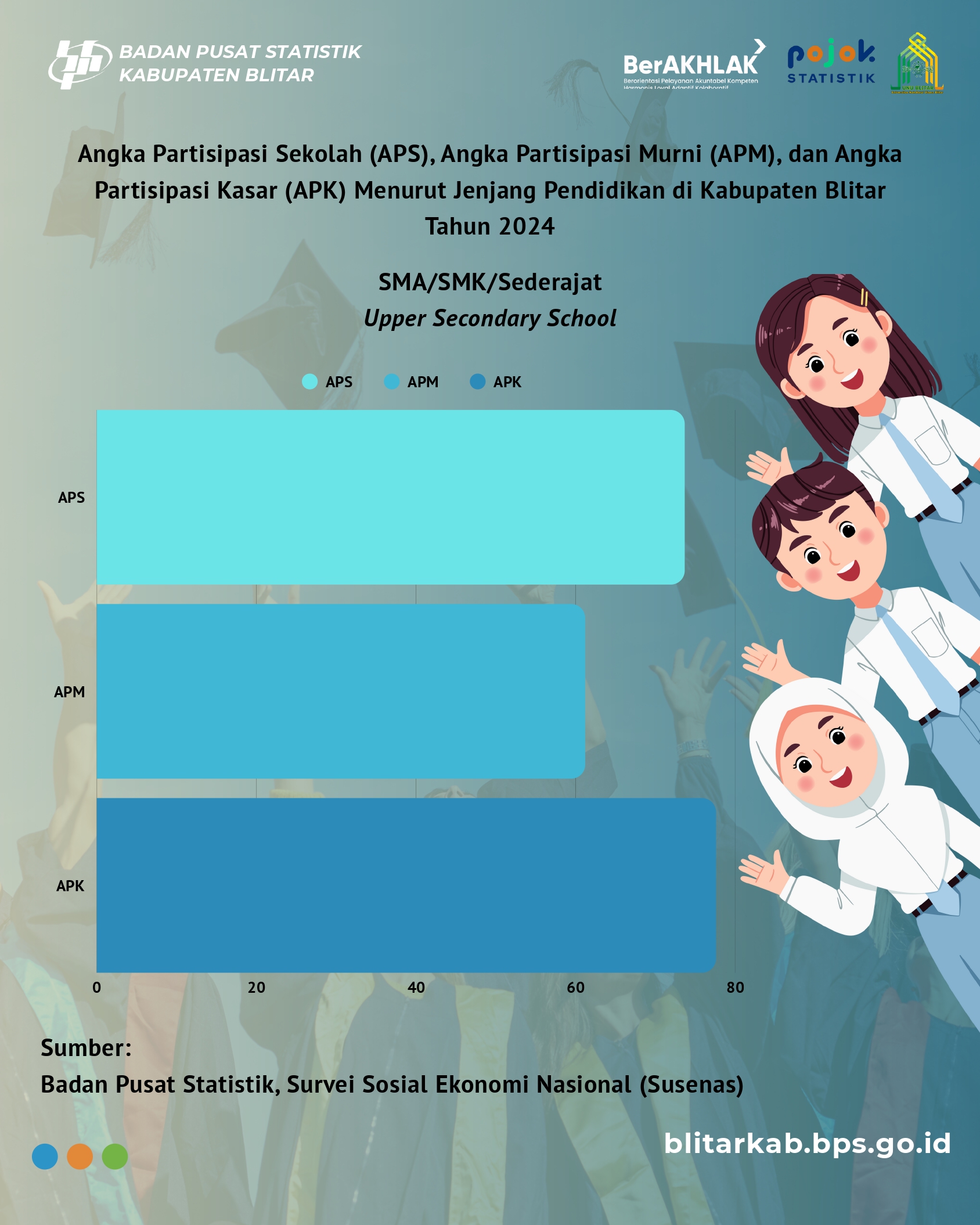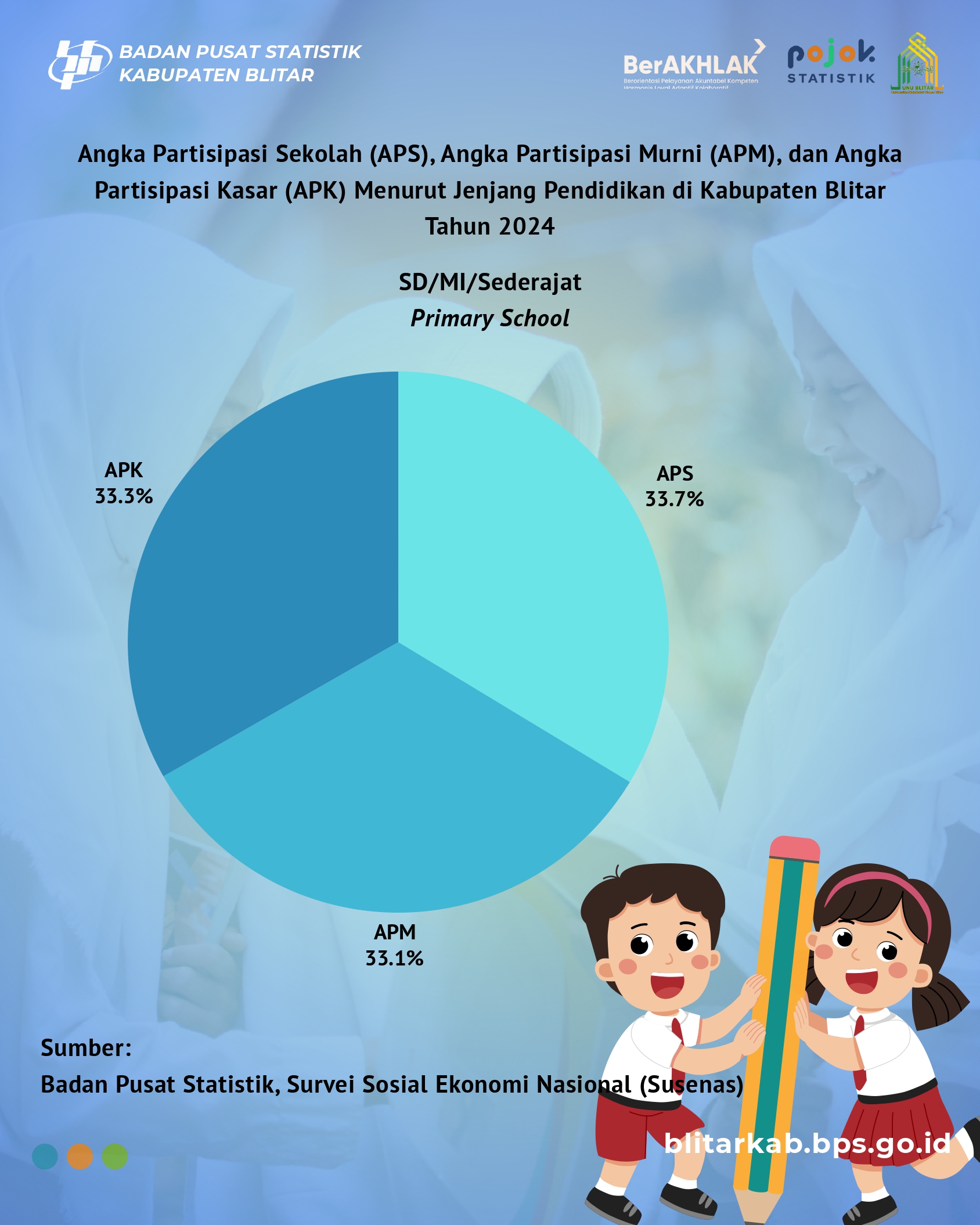 Pada tahun 2024, Kabupaten Blitar mencatat perkembangan positif dalam indikator partisipasi pendidikan yang terdiri dari Angka Partisipasi Sekolah (APS), Angka Partisipasi Murni (APM), dan Angka...