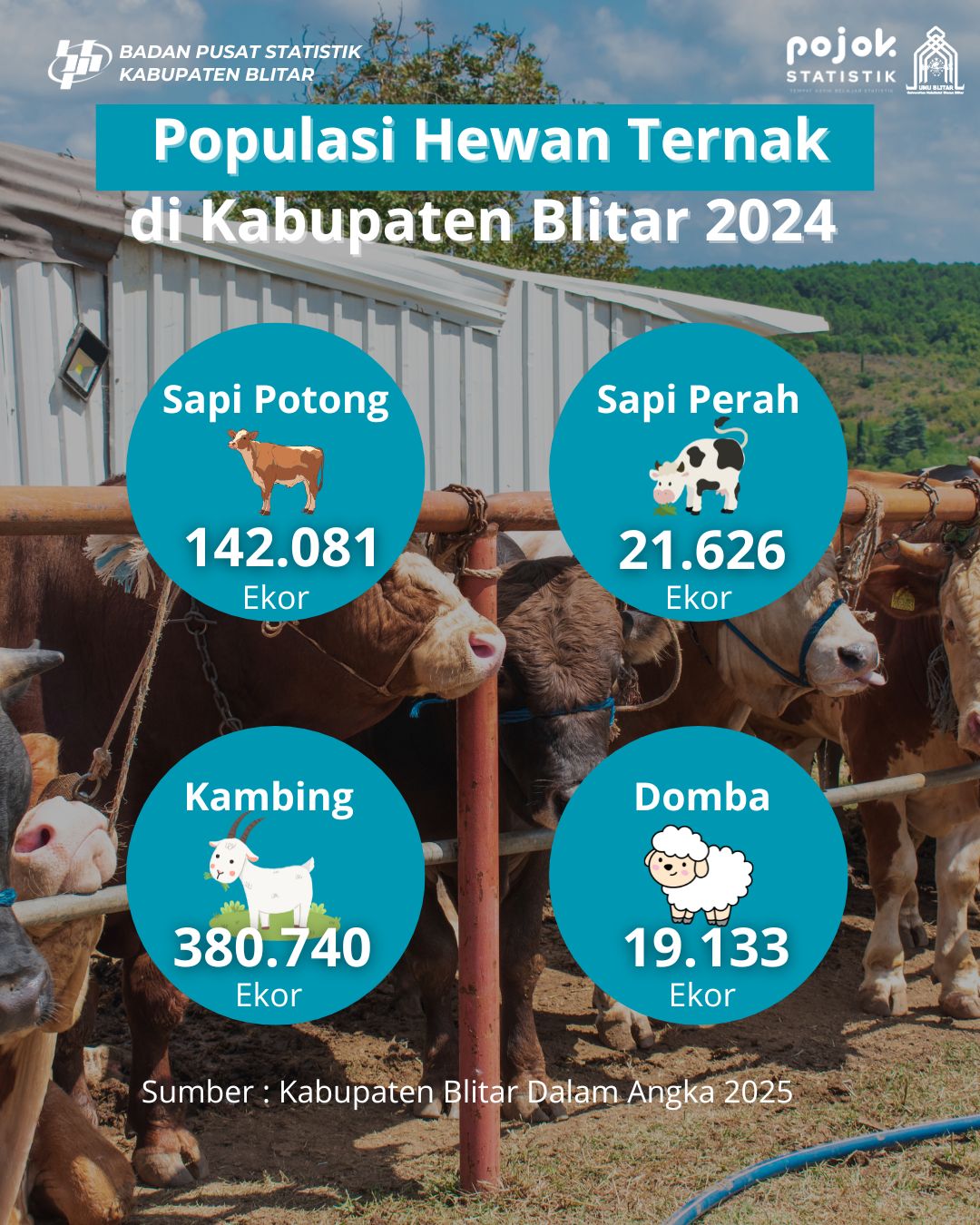 Pada tahun 2024, Kabupaten Blitar mencatat jumlah populasi hewan ternak yang cukup besar. Sapi potong tercatat sebanyak 142.081 ekor, sedangkan populasi kambing mencapai 380.740 ekor....